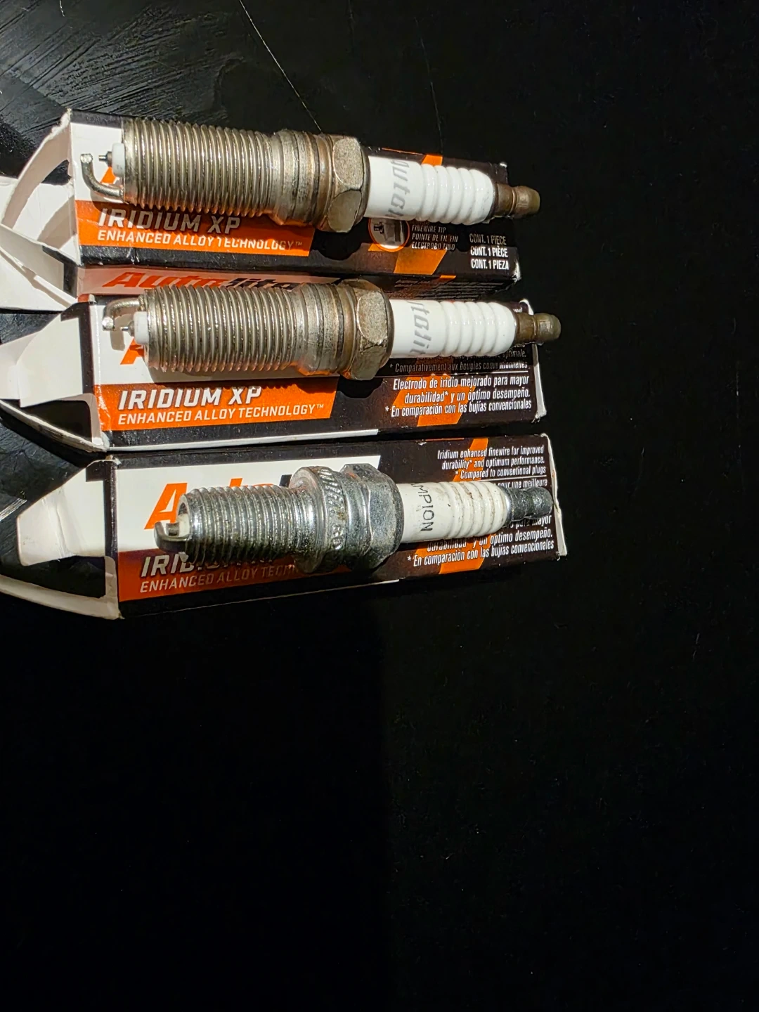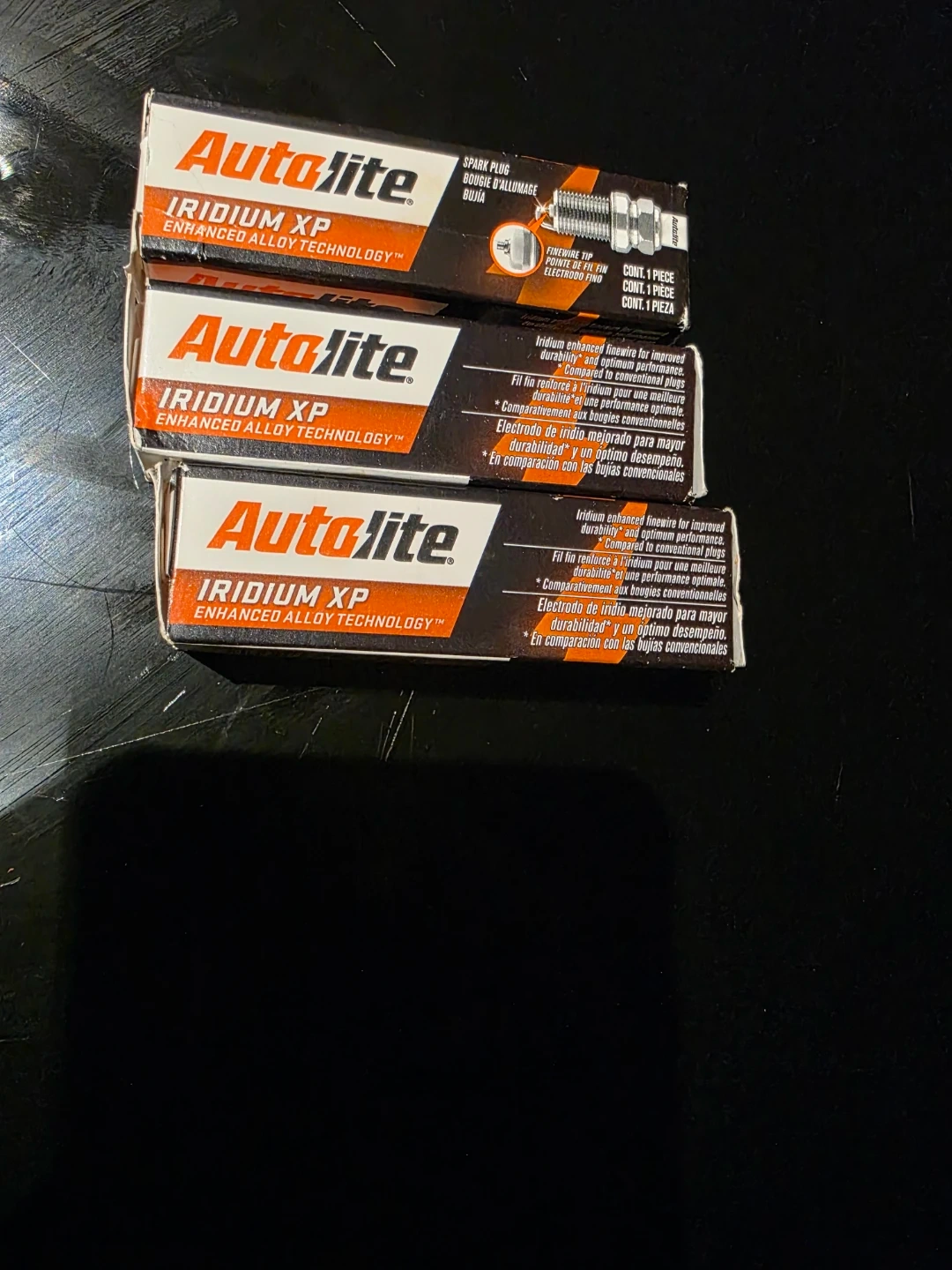 Three Autolite Iridium XP spark plugs. They feature enhanced alloy technology for improved durability and optimum performance. These plugs are designed to deliver the best possible combustion. Great for tune-ups!