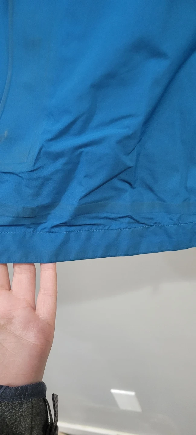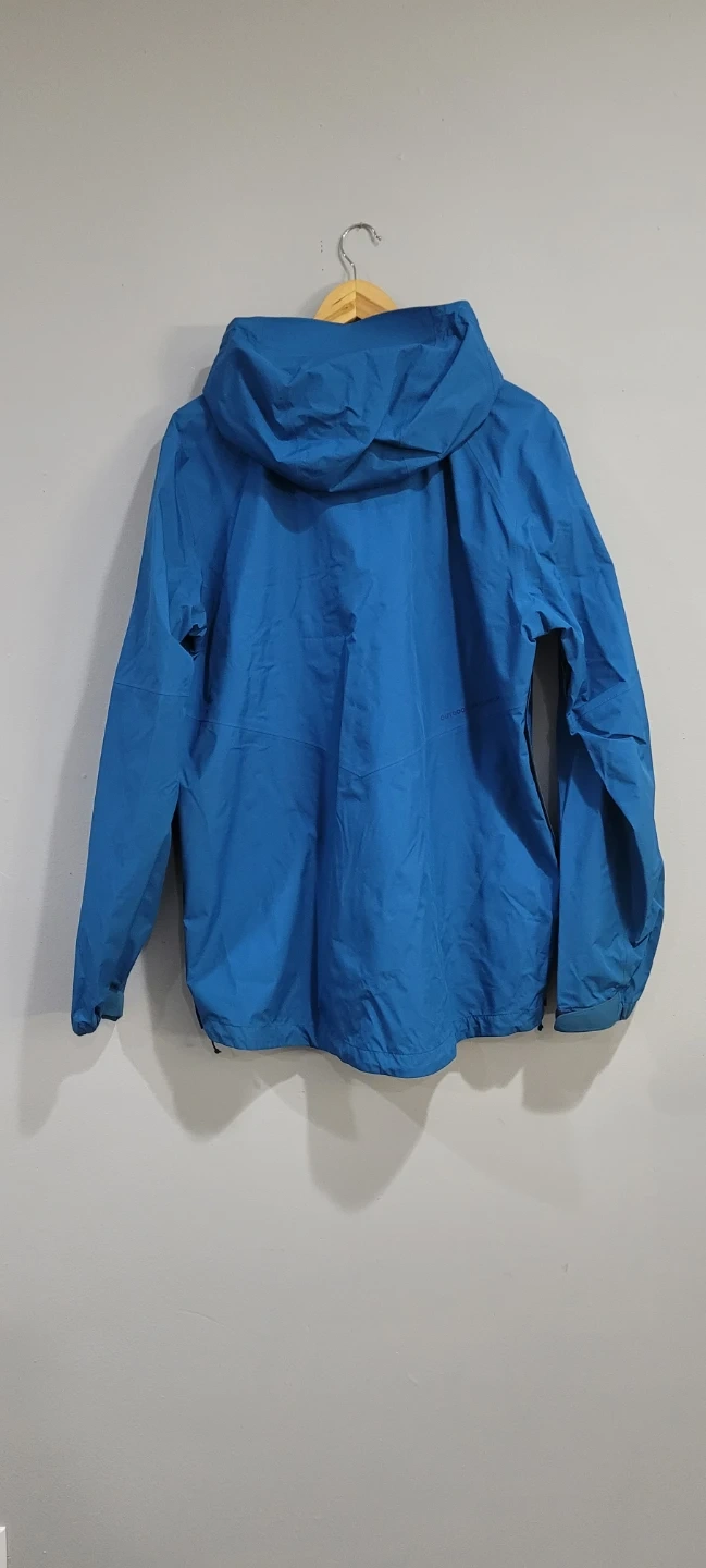 This is a blue Outdoor Research rain jacket. It's a mens size Large. There are some faint stains on the fabric. Good for outdoor activities!