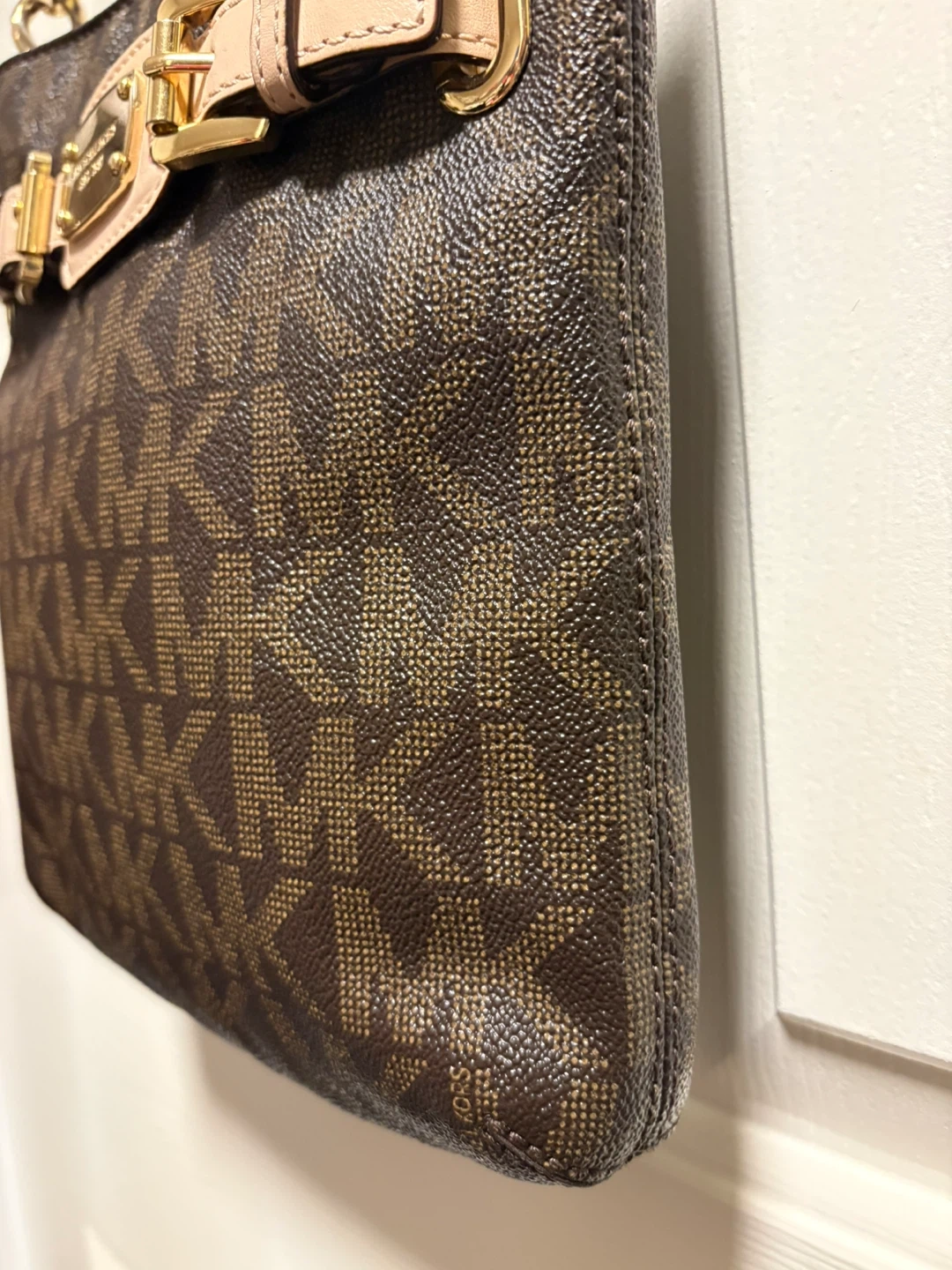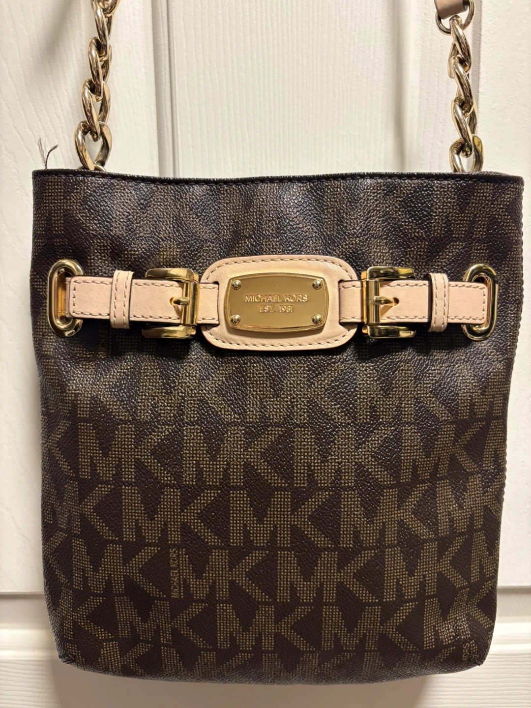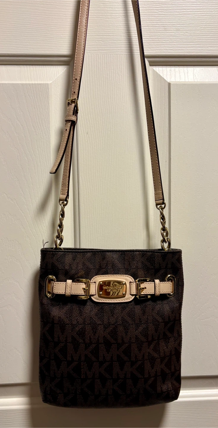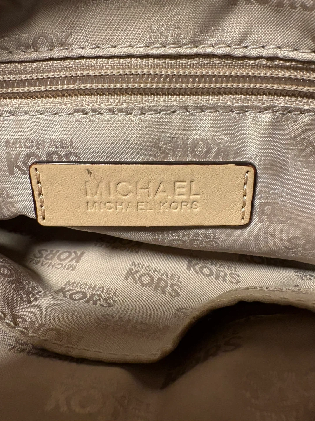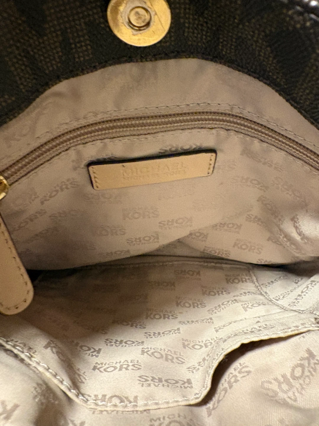 Michael Kors crossbody bag in signature MK print. Beige leather trim and gold-tone hardware. Interior has a fabric lining with the Michael Kors logo pattern. Snap closure on the front flap. The bag is in great condition, just like new! Pick up in Chestermere.