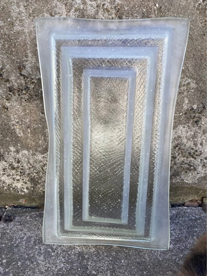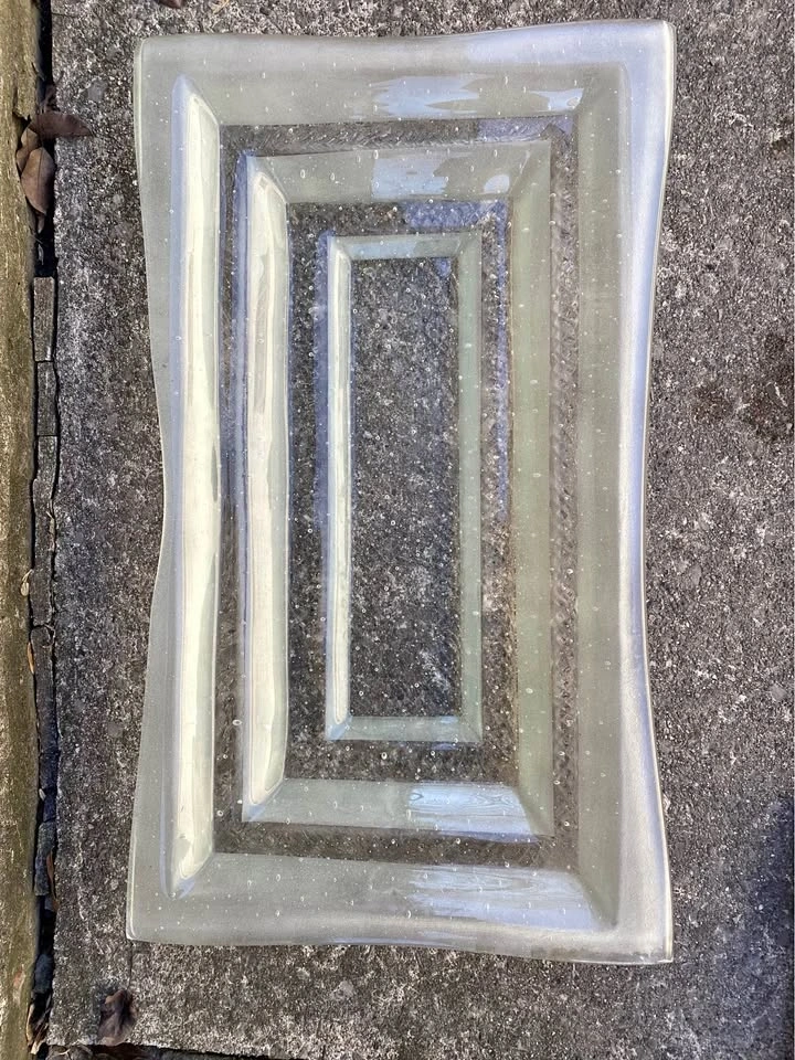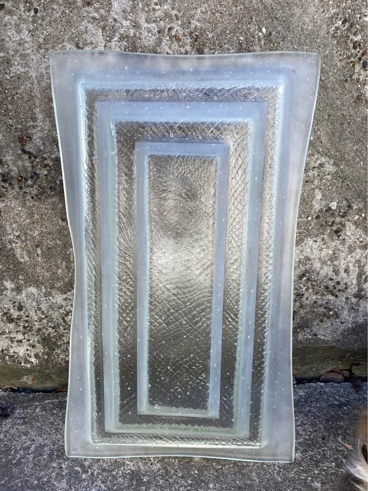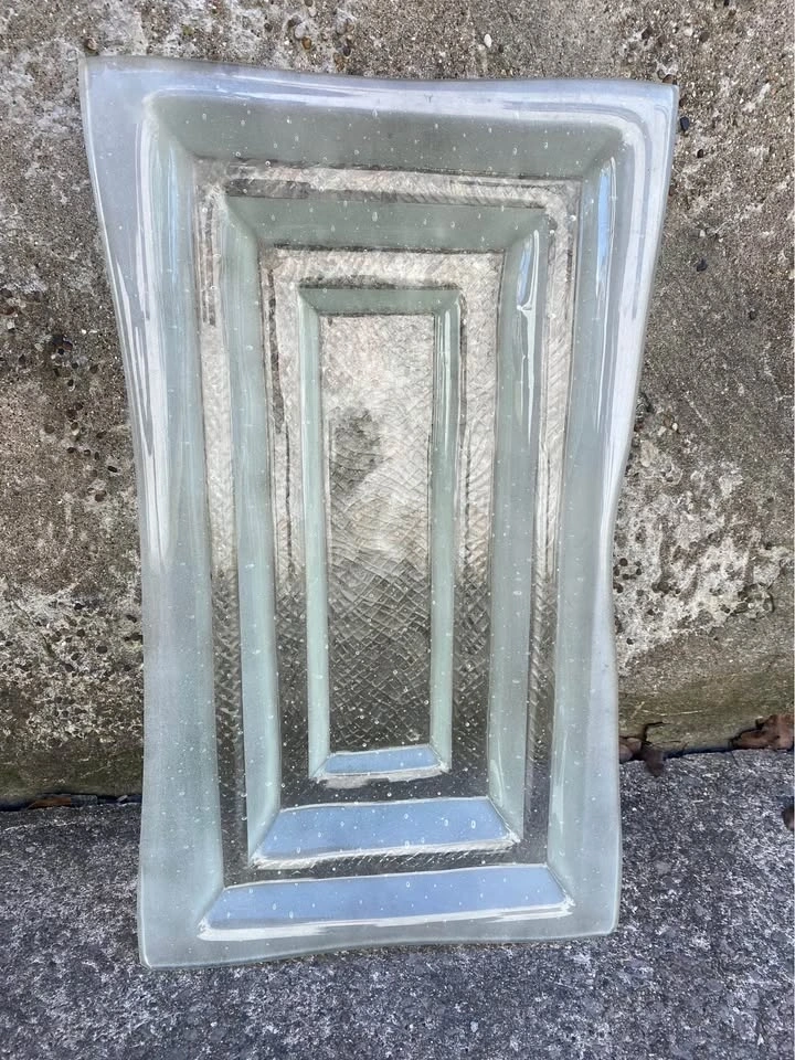 Add a touch of elegance to your table with this rectangular glass serving dish, perfect for appetizers or desserts! This piece features a unique, tiered design with a clear, frosted finish, and it is in used condition, showcasing some minor signs of wear that add to its character. Shape: Rectangular, Material: Glass, Colour: Clear/Frosted, Design: Tiered. 25.5” x 15.75”. This dish is ready to make your treats shine. If the ad's up, it's still available!