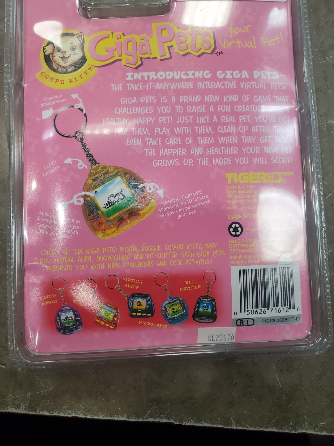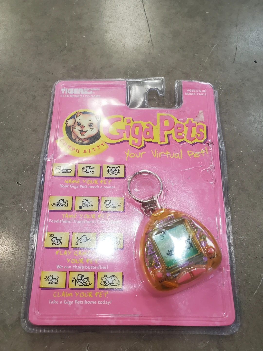 Introducing Giga Pets, a brand new interactive virtual pet game. Name your pet, feed them, play with them and clean them up. The Compu Kitty version challenges you to raise a fun creature. It's a digital LCD game for ages 5 and up.