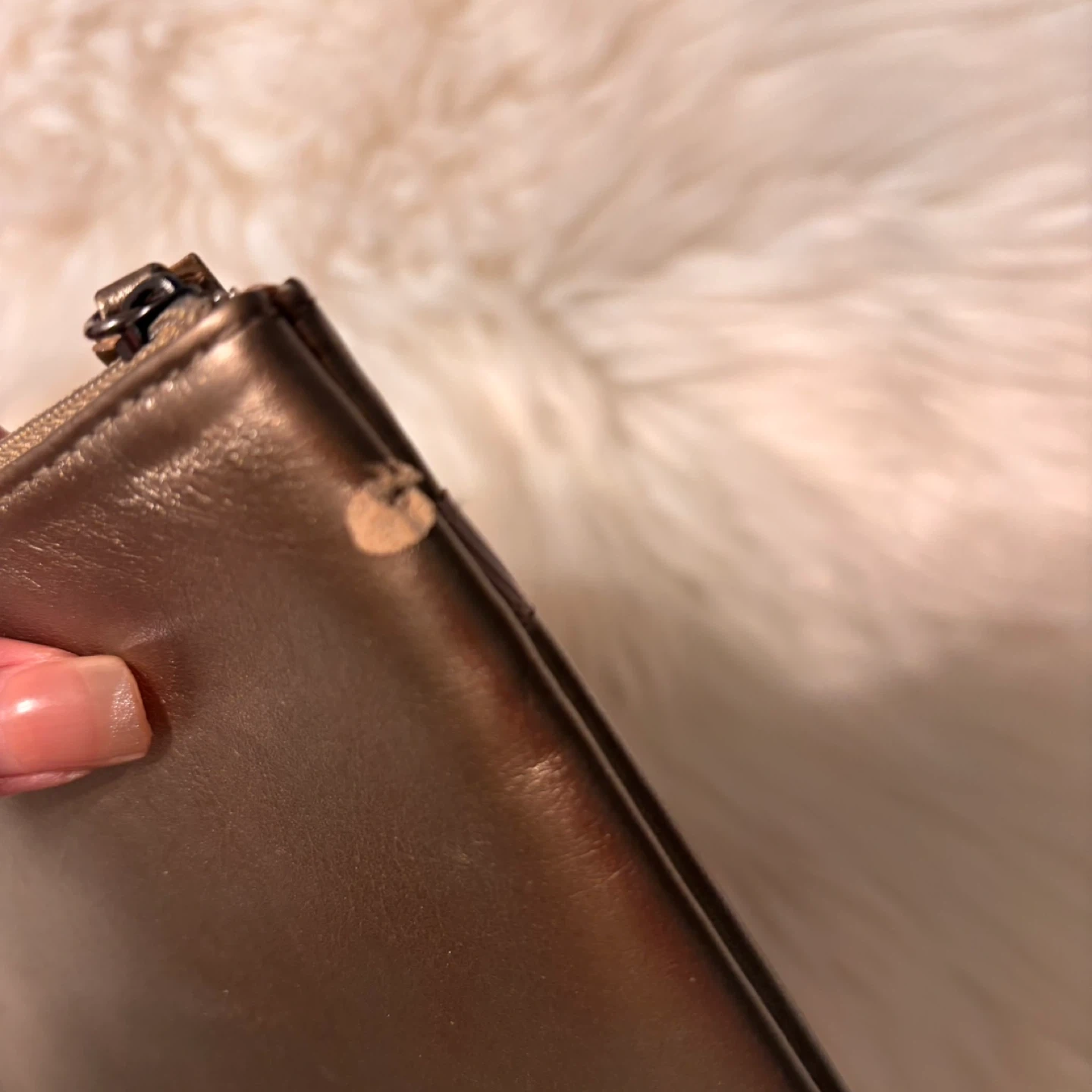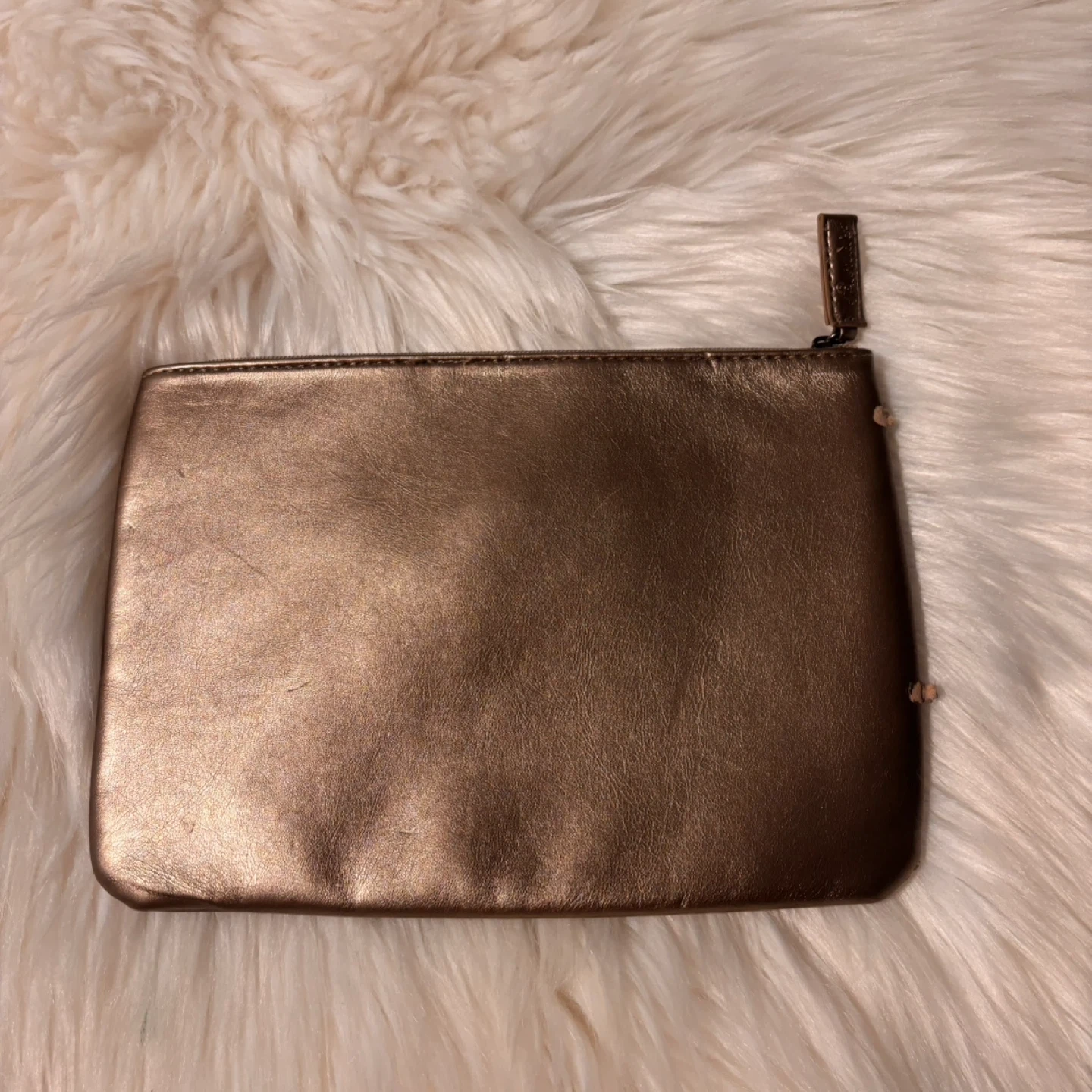 This is a bronze-coloured cosmetic pouch from Guerlain. It's made of a faux leather material and has a zippered closure. It also includes a decorative tassel charm, still in its original packaging.