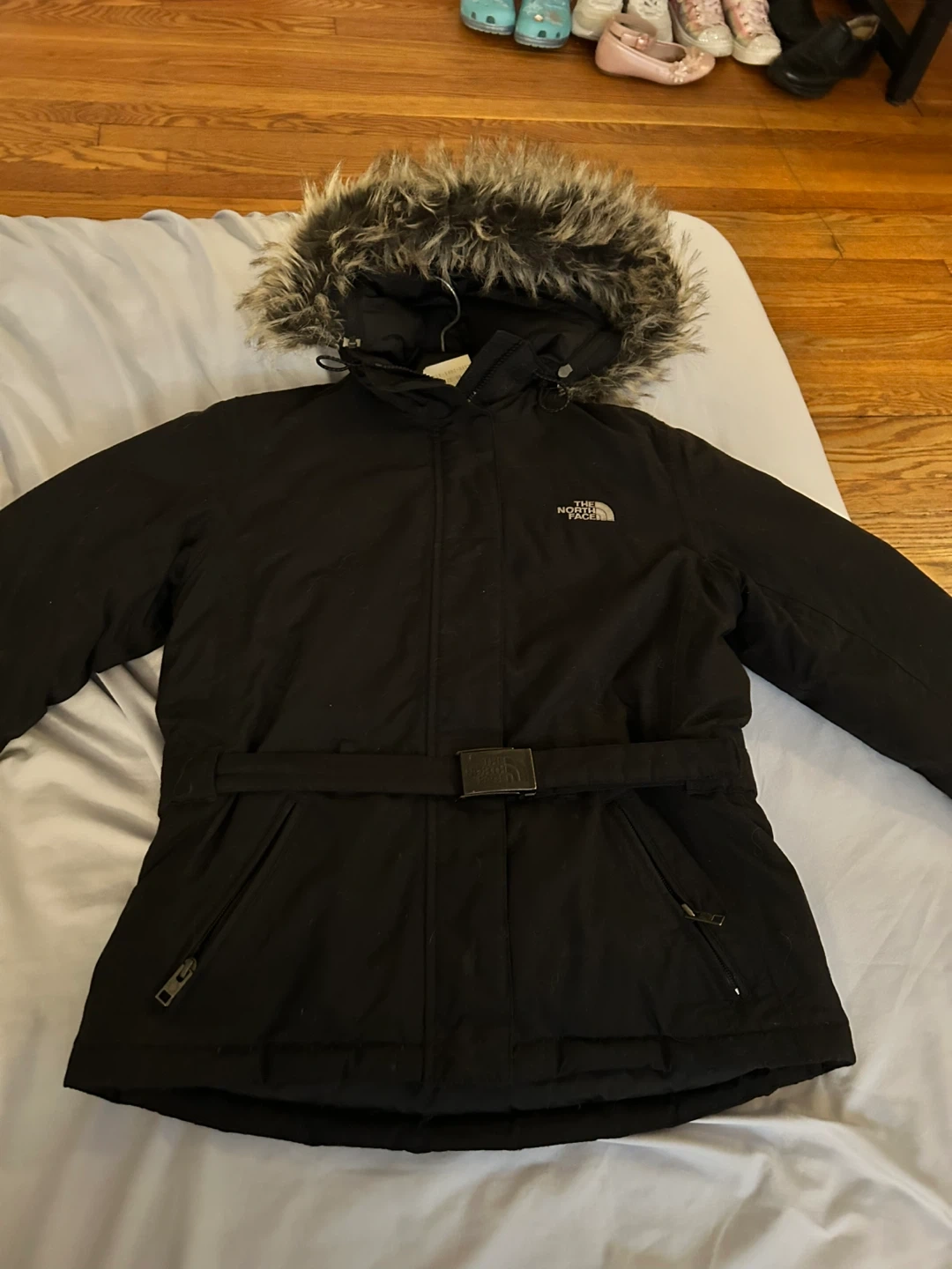 This is a black parka jacket from The North Face. It features a faux fur-lined hood and a buckle belt at the waist. Zipper pockets are included for storage.
