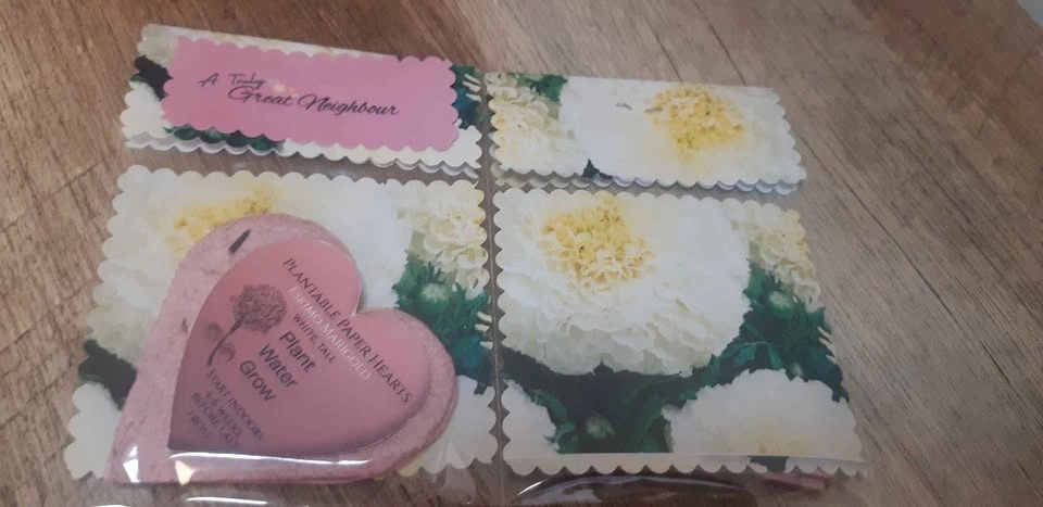 Each package has 3 plantable paper hearts, each heart is made of paper and has Eskimo Marigold seeds embedded within it. These hearts will grow into beautiful flowers when planted to enjoy all summer long. Just place hearts on top of soil in sunlight (each one in a separate pot) and keep moist to grow.