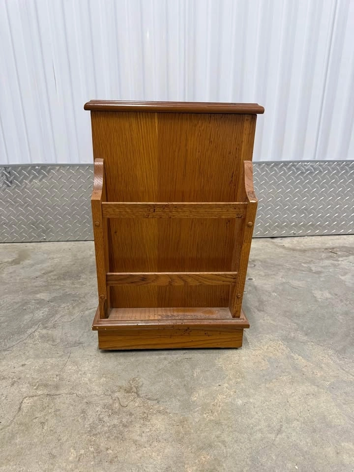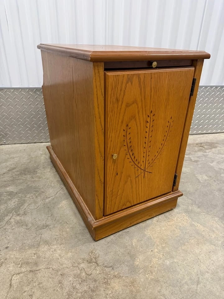Nice older cabinet and end table. Has a few loose drawer inside. Room to store larger things (no shelves). Has a magazine rack on the backside. Overall in good condition. Has a bit of basic wear from use. Measurements 22x12 Top.