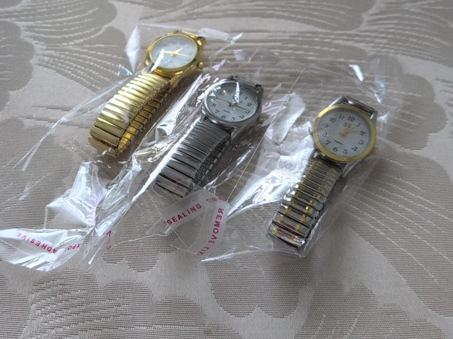 Set of three ladies' watches. One gold-tone and two silver-tone with stretch bands. Quartz movement visible on one watch face. These are a practical addition to any outfit!
