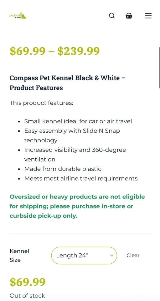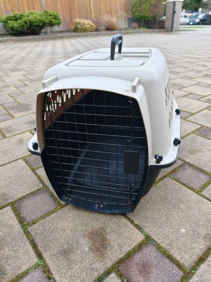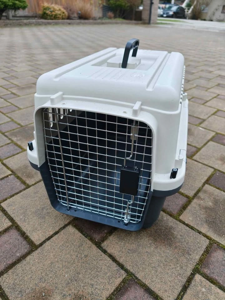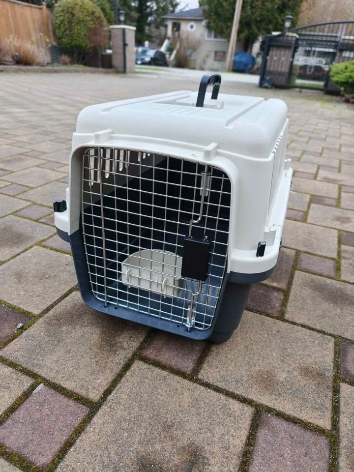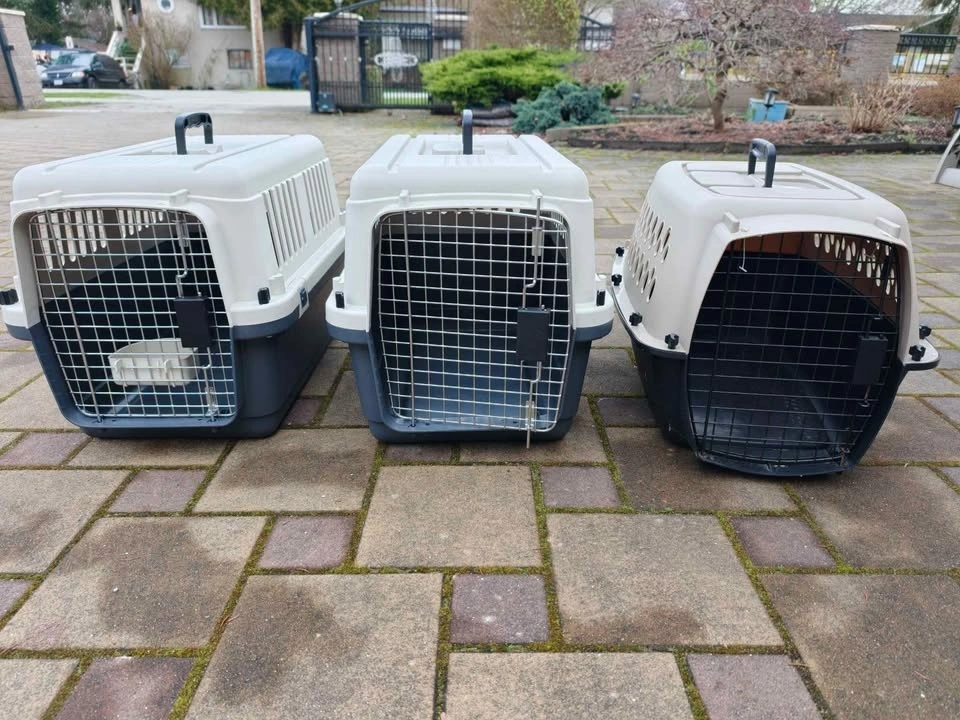 Sturdy dog and cat kennels available for $30 each. These are flight approved and measure 24x16x15 inches, suitable for pets up to 20 lbs. They are made of all plastic with metal gates and are great for car trips, home use, or flights.