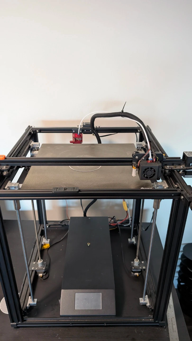 This is a large format 3D printer Ender 5 plus with silent upgrade motherboard with a substantial build volume. It features a robust aluminum frame and a heated upgraded flex print bed. The printer uses standard filament spools. It's suitable for printing large objects or multiple smaller items at once. May need some PDI tuning and belt tensioner. Can give additional parts like nozzles - 0.4 to 1mm.