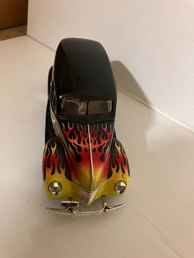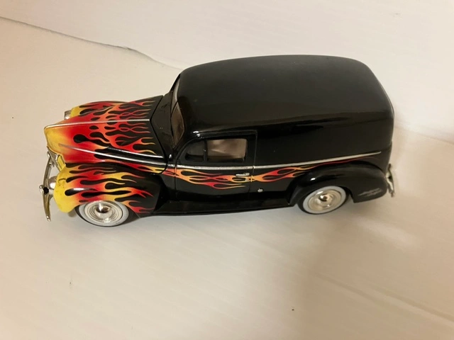 This is a die cast model of a 1940 Ford Delivery Wagon. It is black with yellow and red flames. The model has a chrome bumper and wheels. It is approximately 10 inches long.