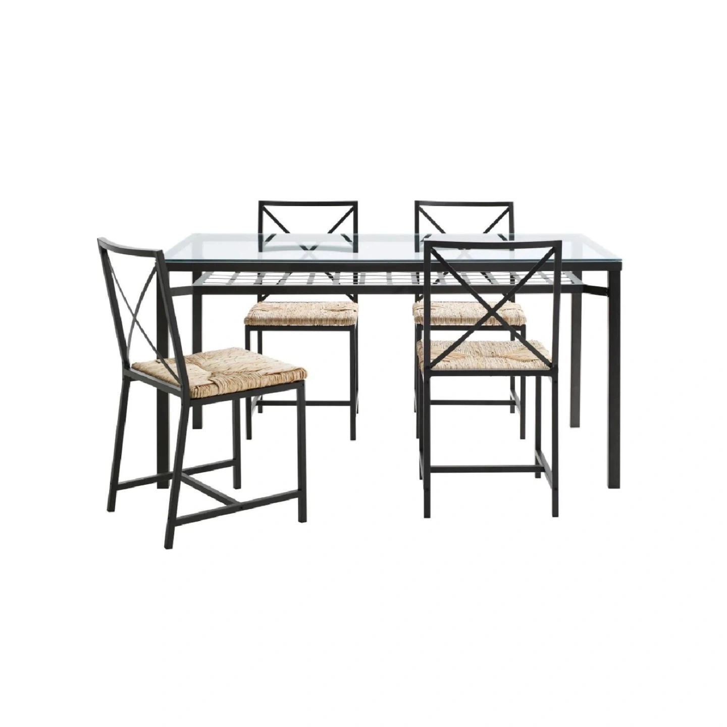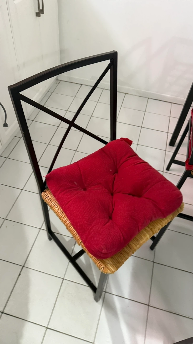 Selling a set of dining chairs with black metal frames and woven seats. One chair has a red cushion, while the others have the natural woven seat showing. They'd be a great addition to any dining room!