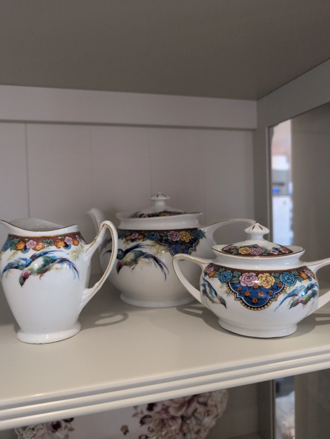 This is a lovely three-piece porcelain tea set with a bird and floral design. It includes a teapot, a creamer, and a sugar bowl. The set is white with colourful accents and gold trim.