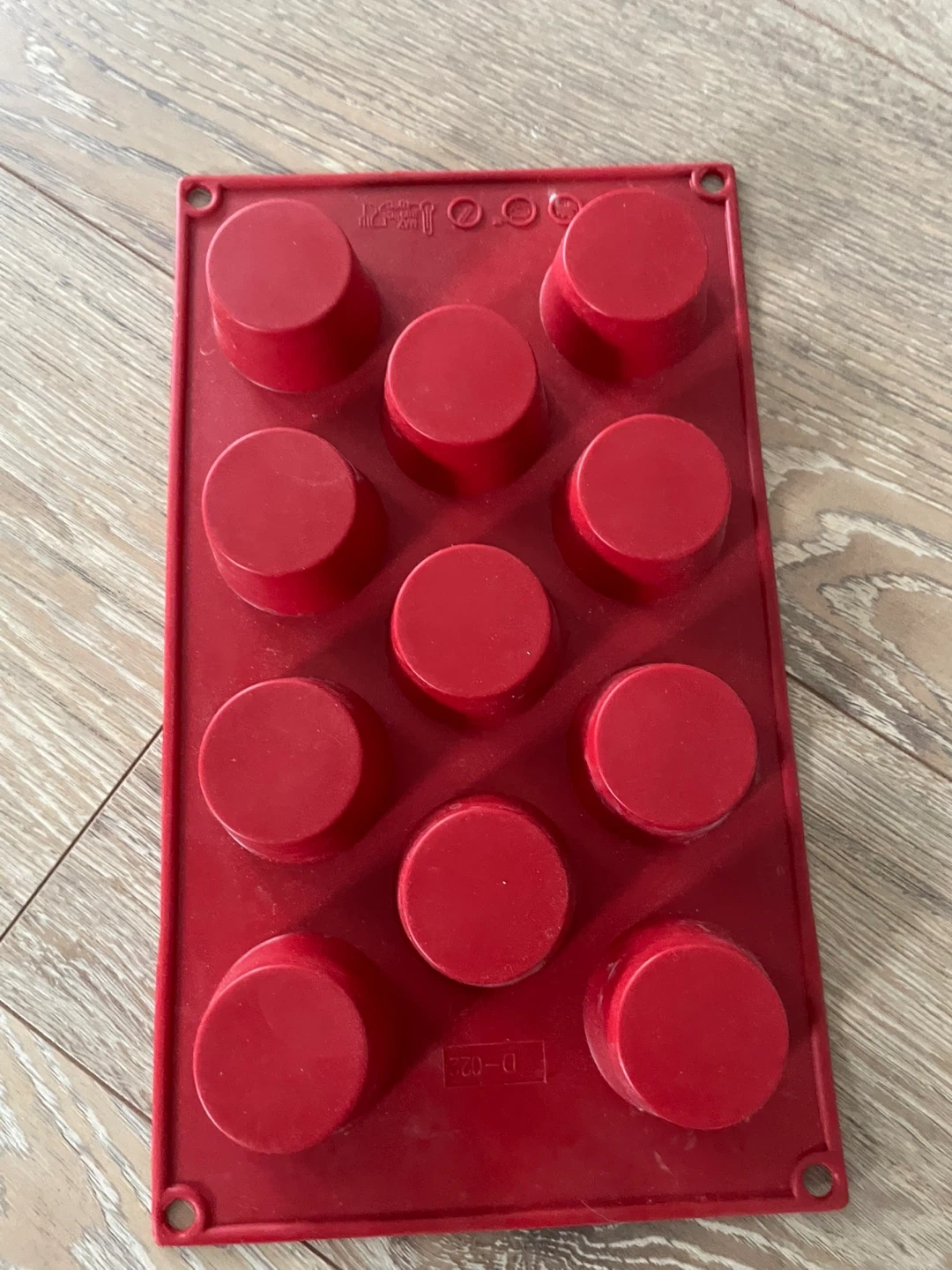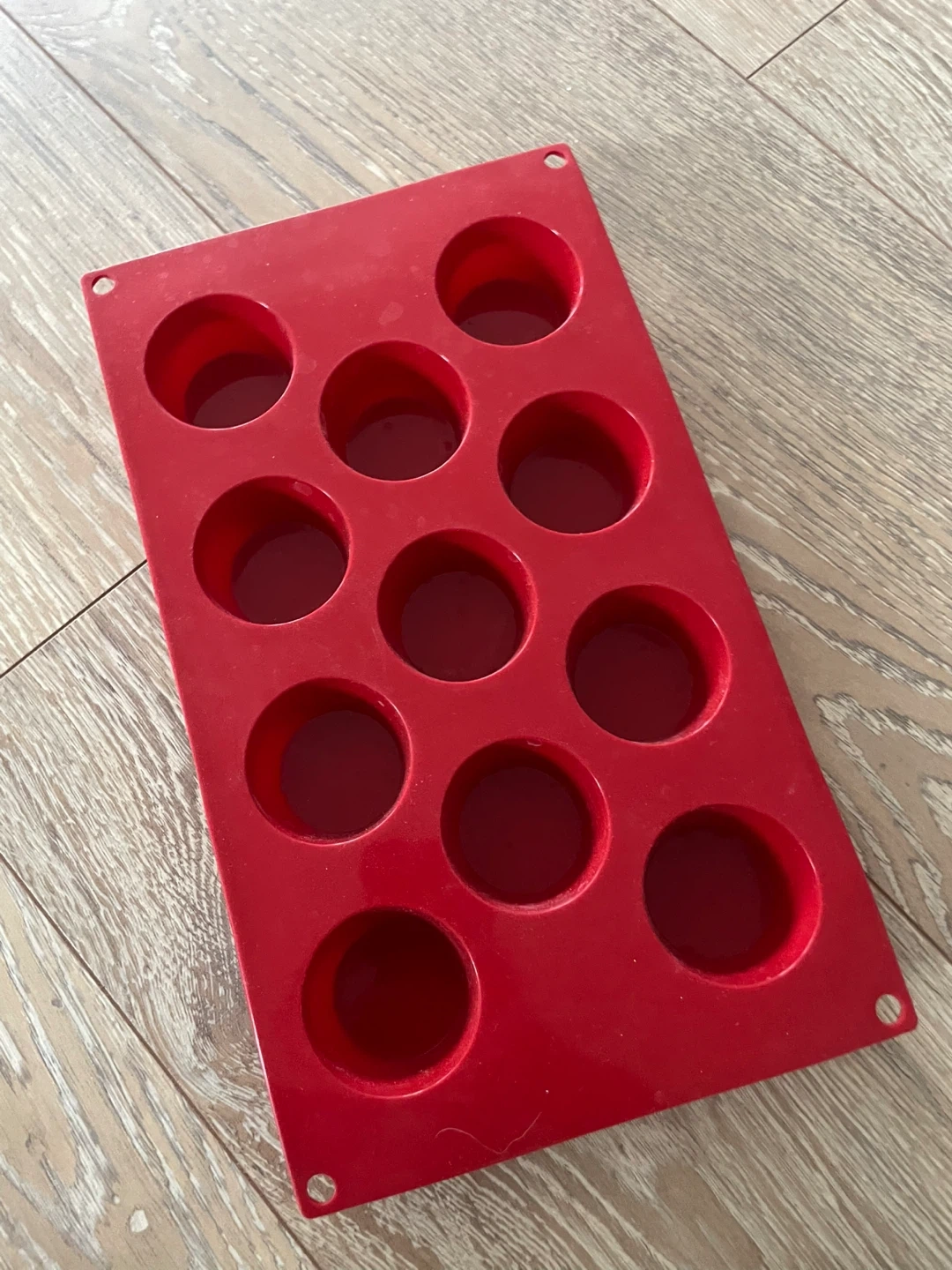Silicone muffin pan with 12 circular cups. It's red and made of flexible silicone. This pan is great for baking muffins or cupcakes!