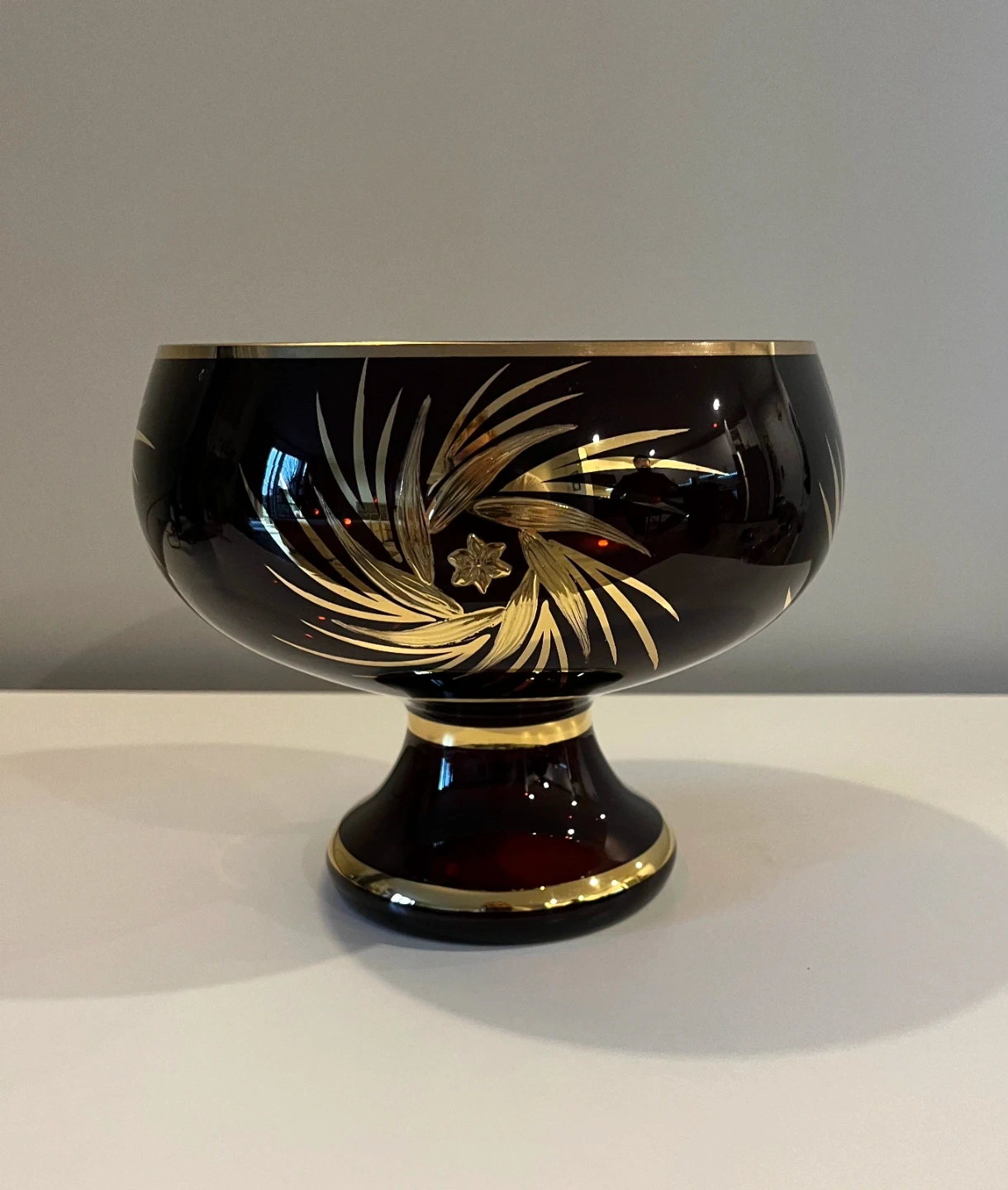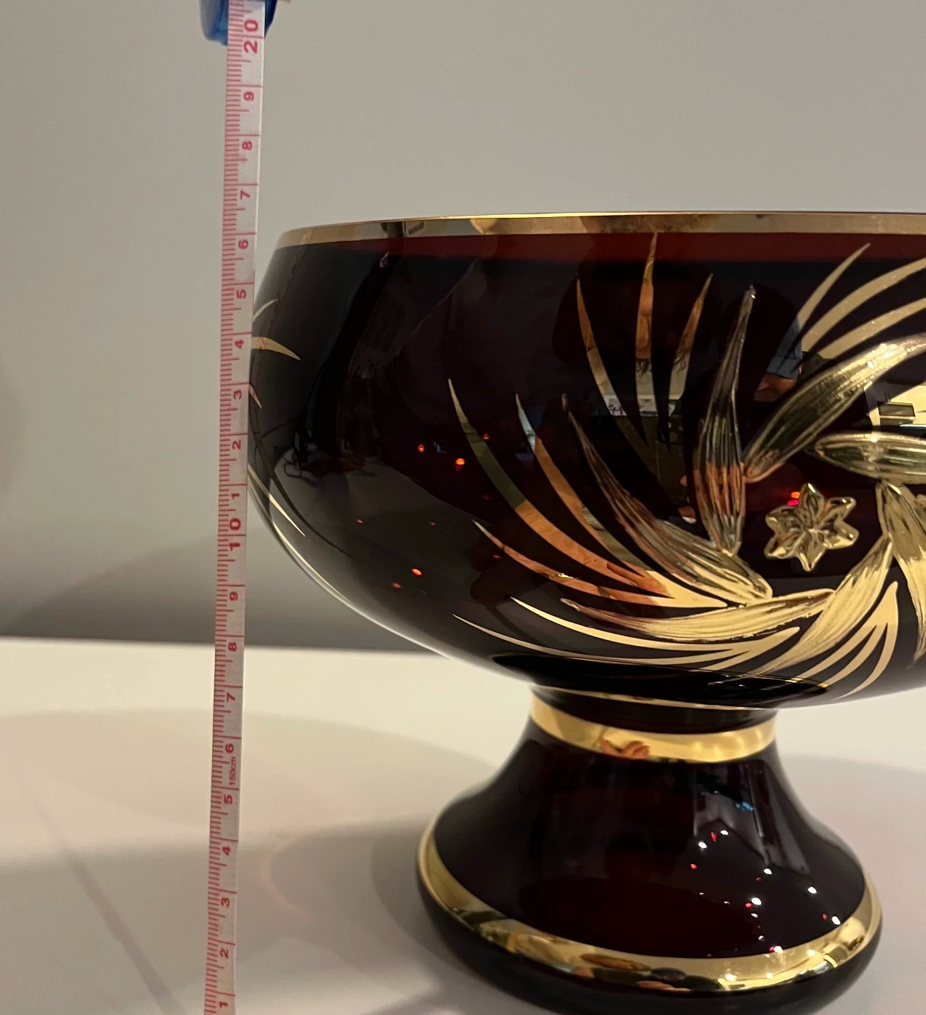 Beautiful dark red glass bowl with gold accents. It features an ornate etched design and a gold rim. Approximately 18 cm tall.