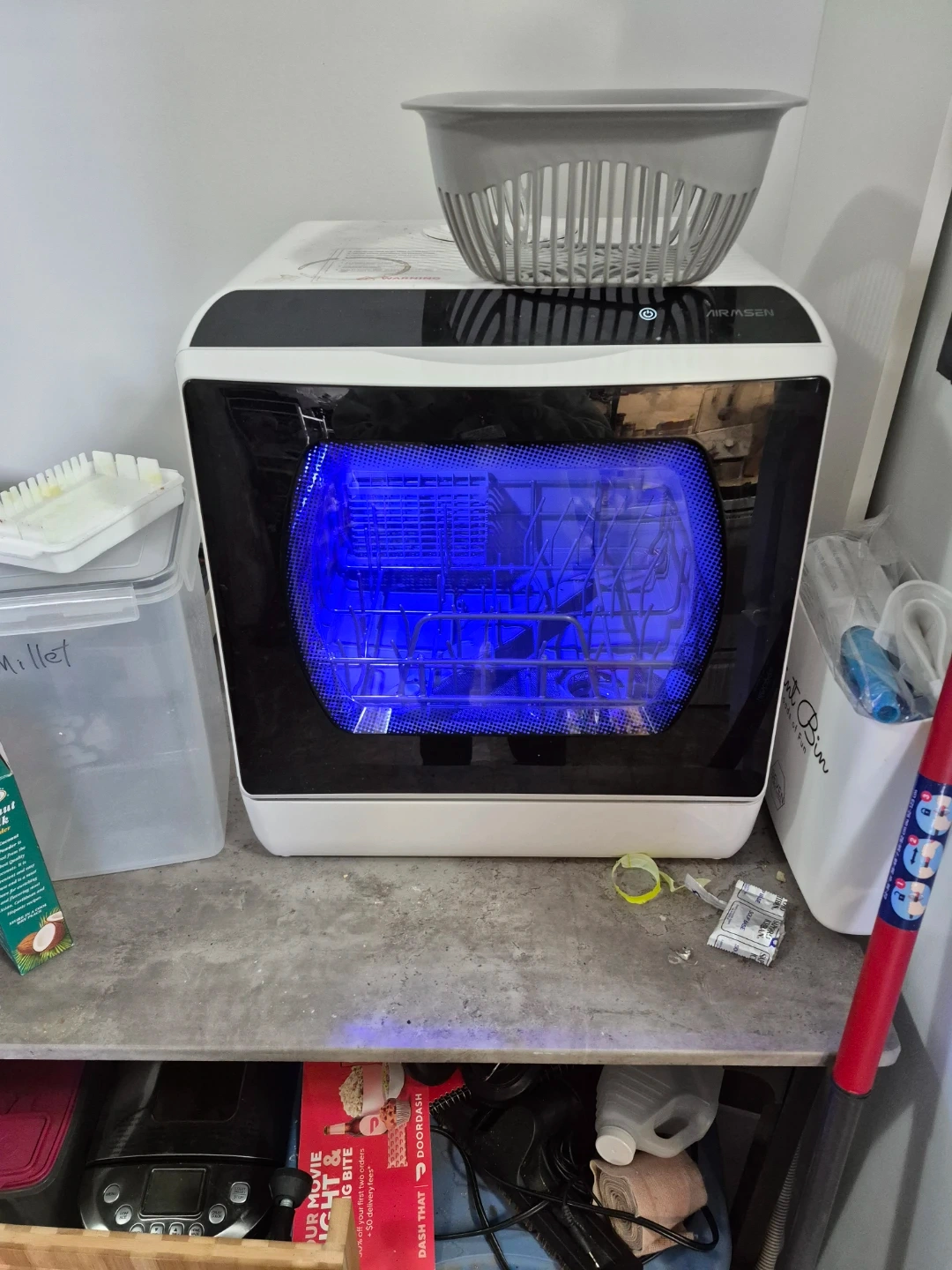 Compact countertop AIRMSEN dishwasher, perfect for small kitchens or RVs. It's a countertop model designed for convenience. Includes a basket for dishes and cutlery and a fruit washing basket. Instructions included. Cash only, no trades