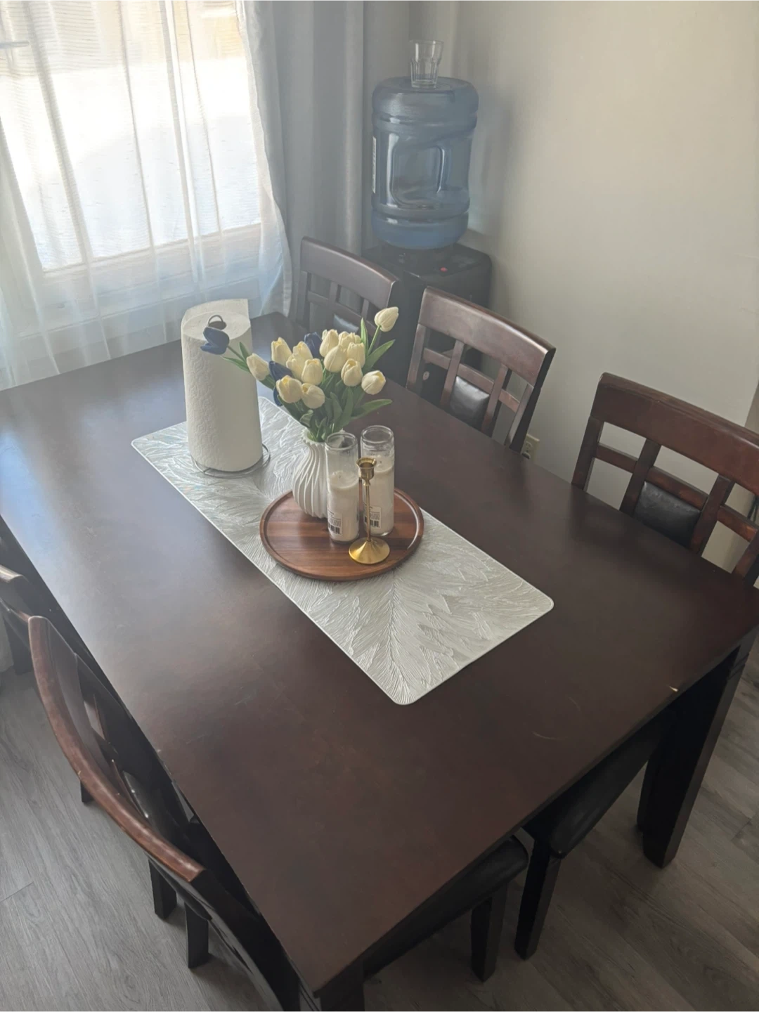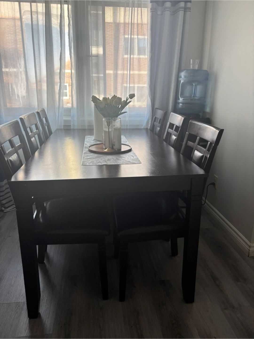 This is a sturdy dark wood dining table with six matching chairs. The chairs are upholstered in a dark material. It's a great set for family dinners or entertaining guests.