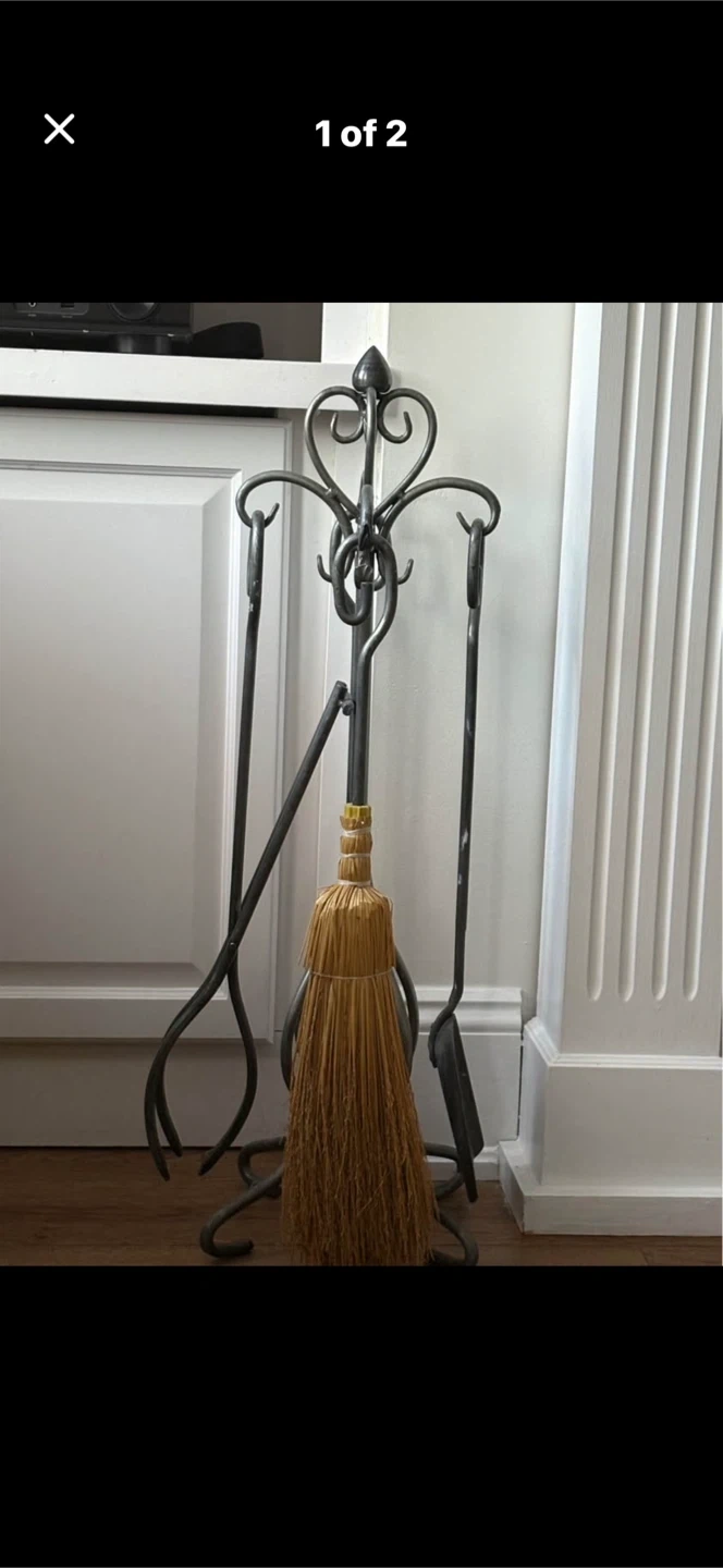 A wrought iron fireplace tool set including a broom, shovel, tongs, and poker. It's a stylish and functional addition to your hearth. This set is made from durable metal.