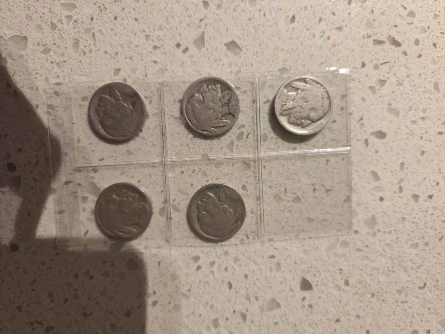 Collection of Buffalo Nickel coins, each representing five cents. These coins are made of metal and feature classic American imagery. They're suitable for collectors or as unique pocket change. 25$ for all the coins