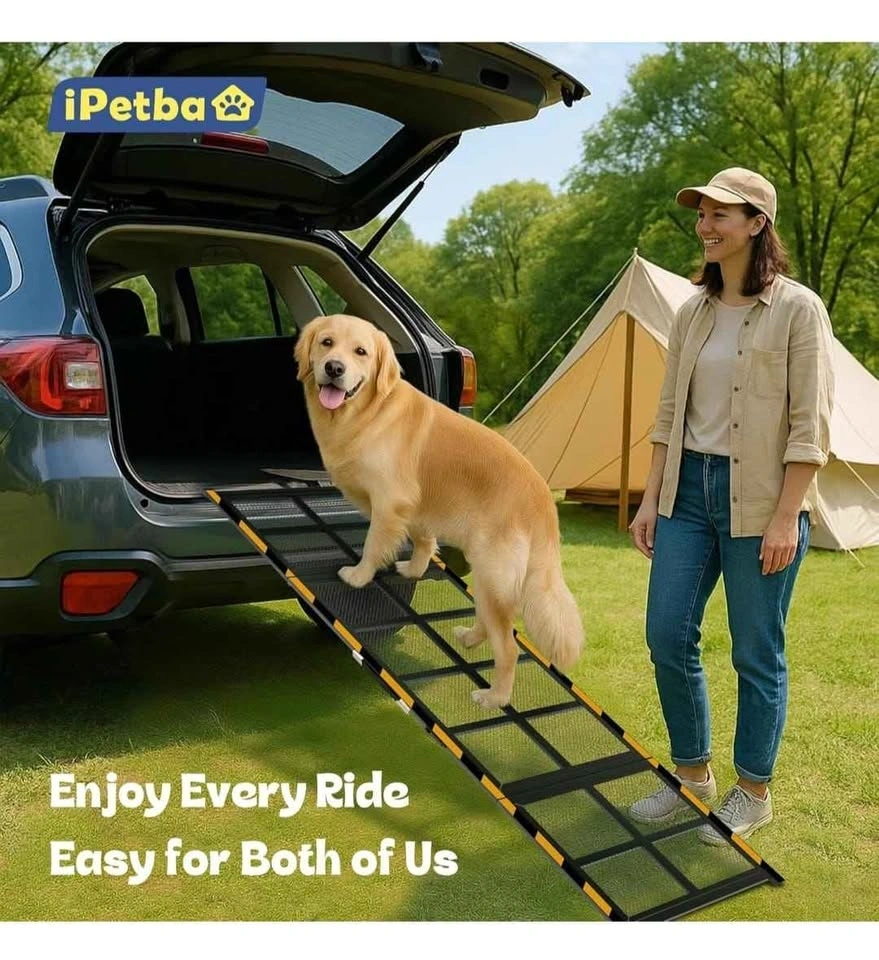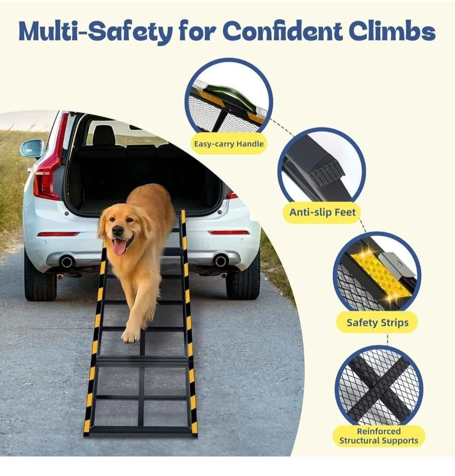 Dog ramp for car, truck, SUV, and stairs. Joint-friendly, anti-slip surface, and gentle slope. Extra wide and stable, supports up to 200 lbs. This ramp is new.