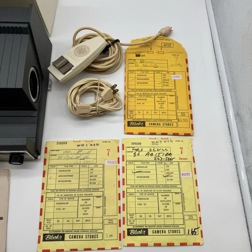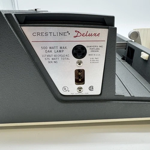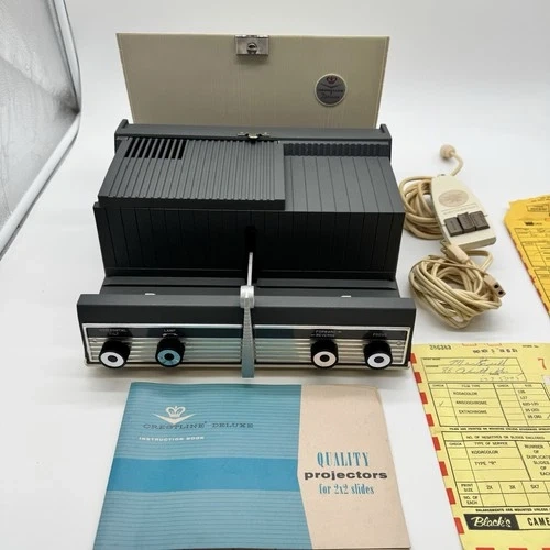 Step back in time with the Crestline Deluxe Slide Projector, a classic piece of equipment designed for the avid photographer or collector. This vintage unit, originating from the United States, offers a touch of nostalgia with its portable and table top projection features, making it an ideal centerpiece for your vintage photography collection or home decor. The projector is compatible with 35 mm film slides and comes with its original box, power cord, and a single unit quantity to add to your collection. Whether it's for projection purposes or as a collectible item, this Crestline slide projector stands as a testament to the era of physical film and slide photography. Comes with original box and services receipts. Item has not been tested.