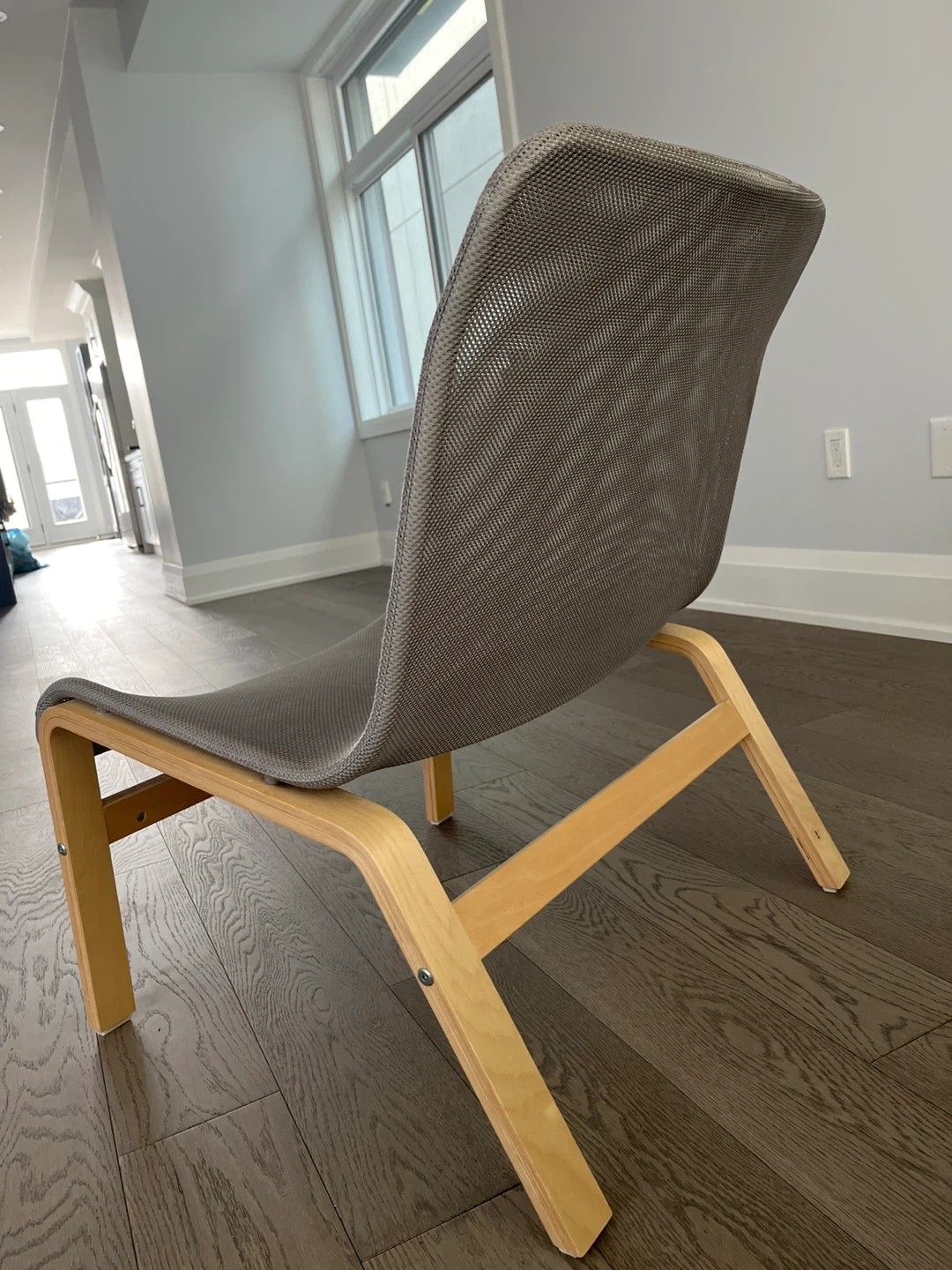 A stylish chair featuring a breathable grey mesh seat and backrest. It's supported by a bentwood frame, offering a modern look. This chair's design makes it comfortable for extended sitting.(It has two stains that come off with a simple wash)
