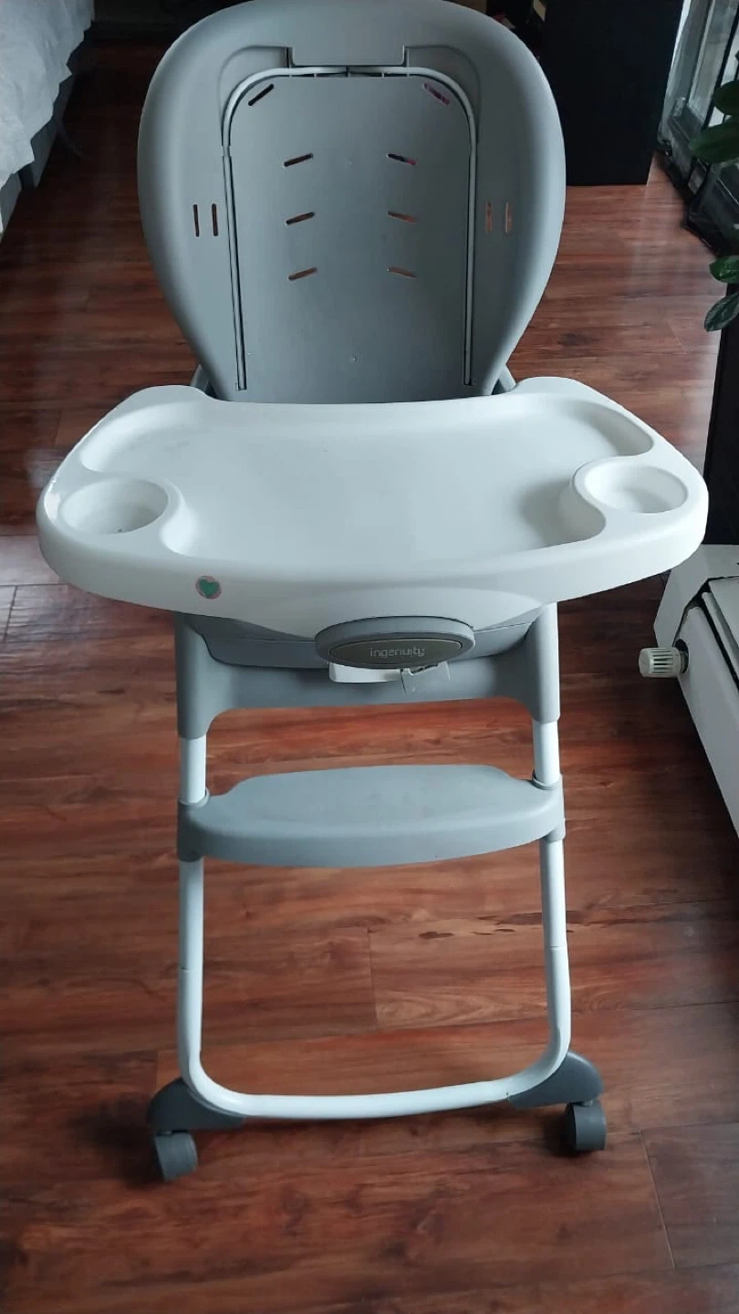 Ingenuity baby high chair. It has a removable tray with cup holders. Tray is dishwasher safe. Collapsible for easy storage.