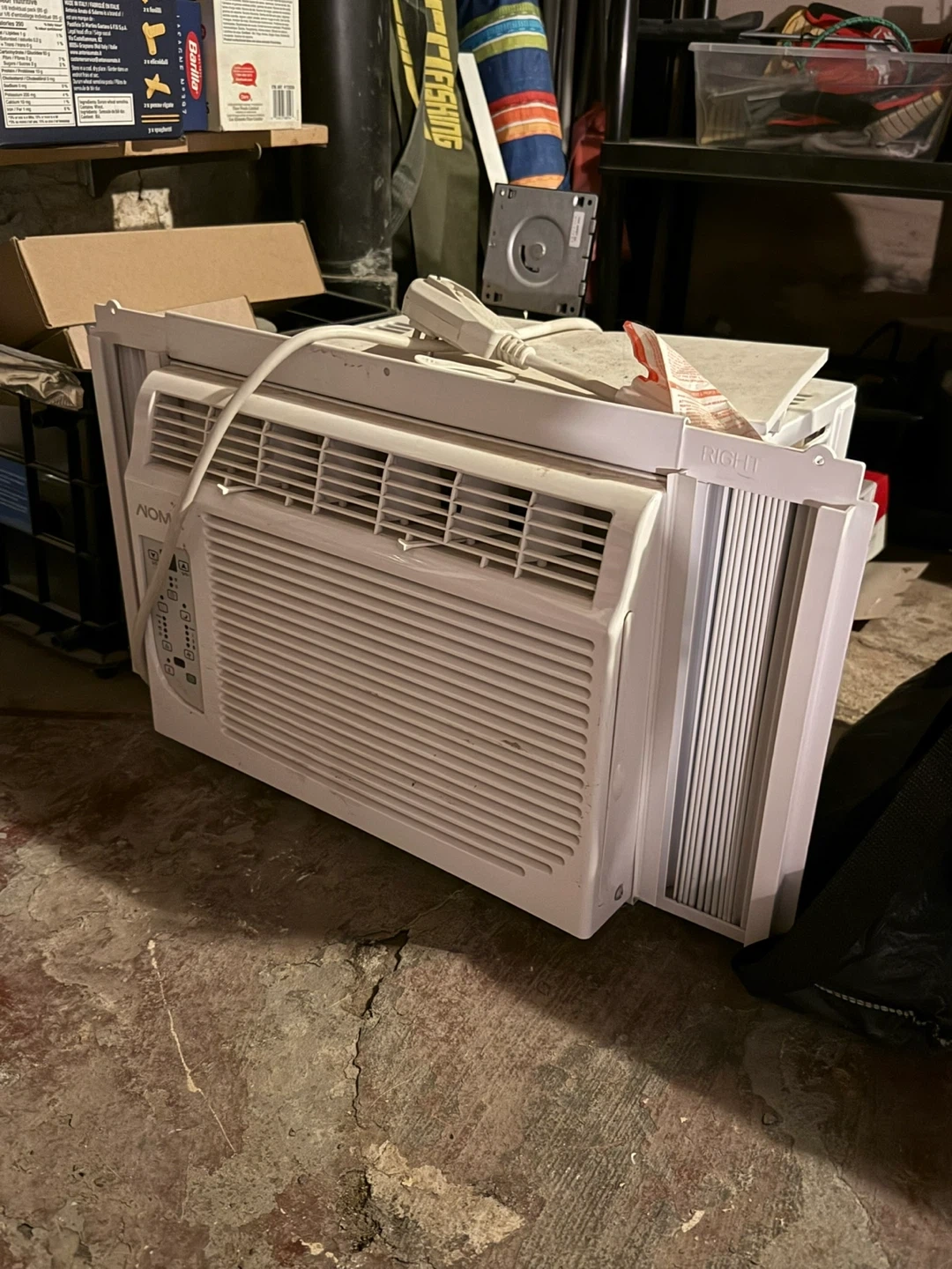 White AOM window air conditioner. It has multiple fan speeds and cooling settings. Comes with a power cord. Works well, no longer needed