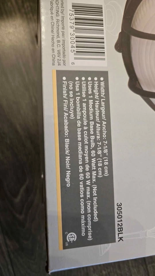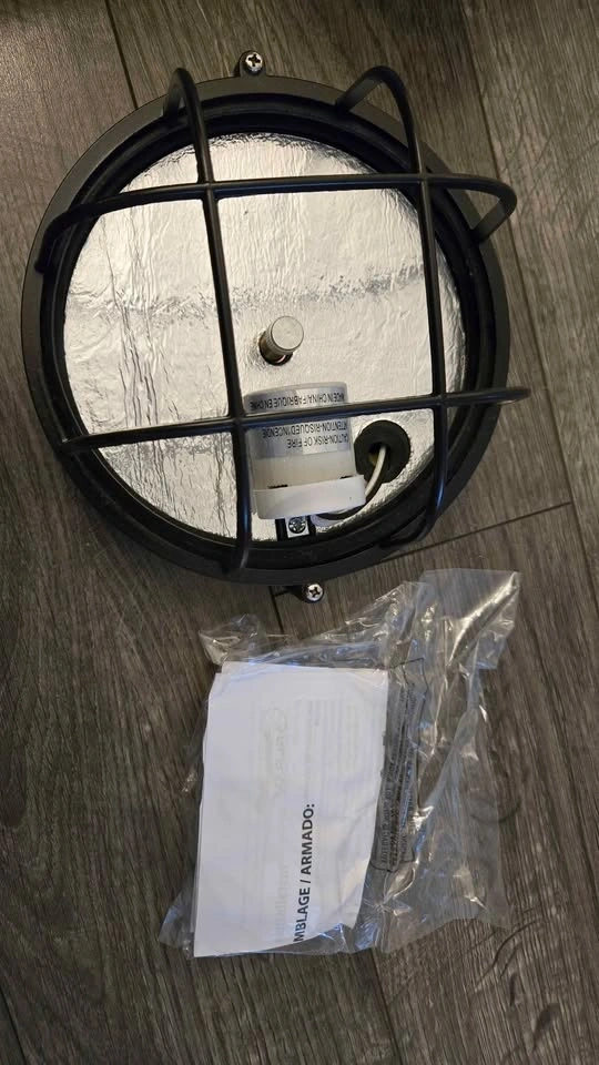 Brand new in box, never installed. This is the Galaxy Marine 7.125-in Black Caged Frosted Glass Outdoor Wall Light. It's CUL listed and comes with a guard. Some assembly is required. It needs a 60-watt A19-shape medium-base (E-26) frosted incandescent light bulb, which is not included. I purchased this new and accidentally broke the glass of my existing fixture when changing a bulb, so I used the glass from this one. Asking $10. Pick up in the Surrey/Clayton area (194th and 68th Ave). Thanks for looking!