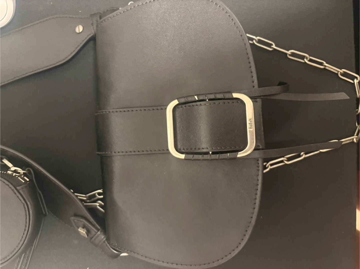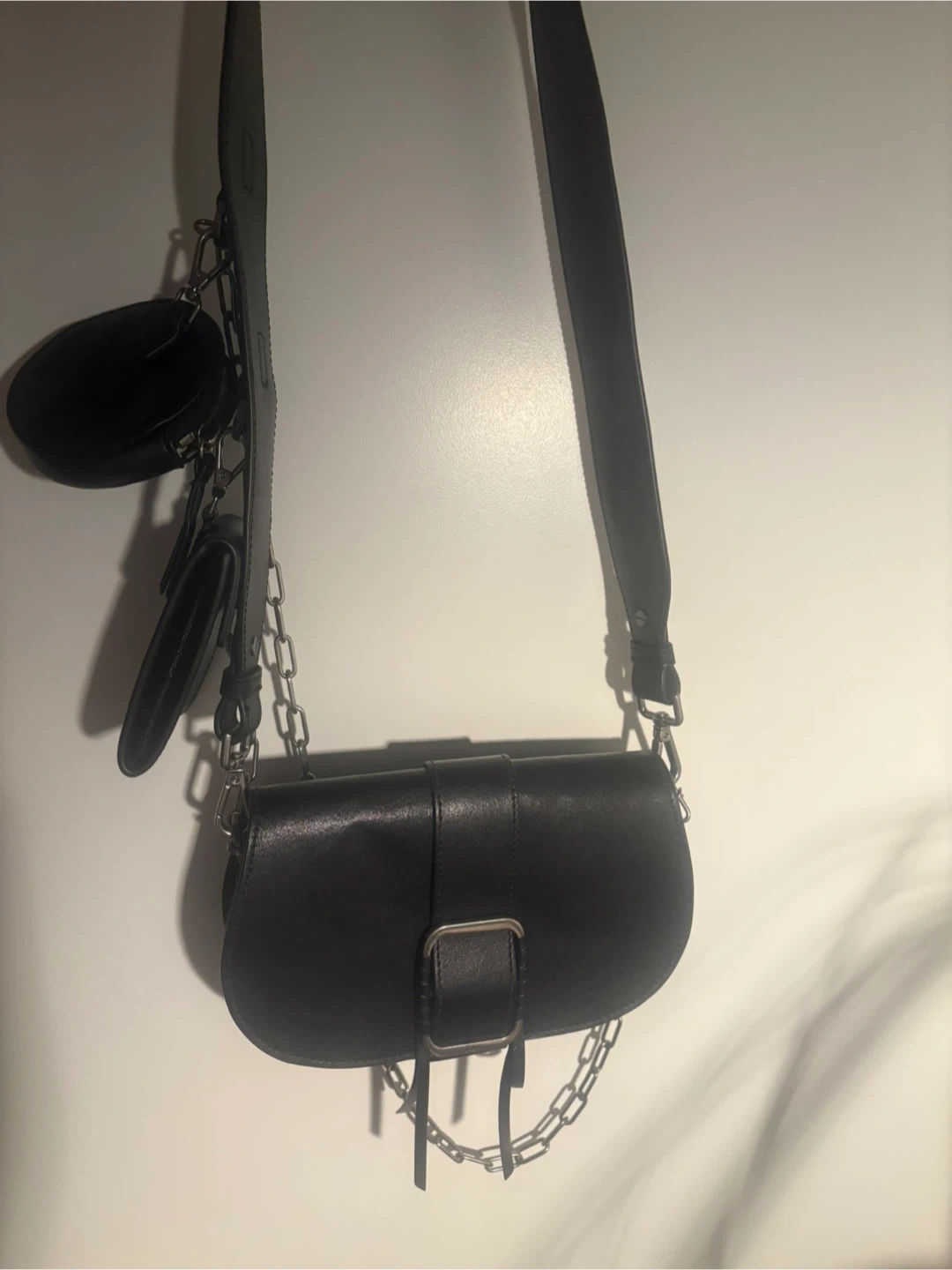 A black leather shoulder bag from Bash. It's accented with a silver buckle and a chunky silver chain strap. Includes a detachable coin pouch and a cardholder. Leather material.