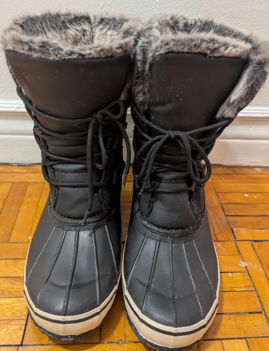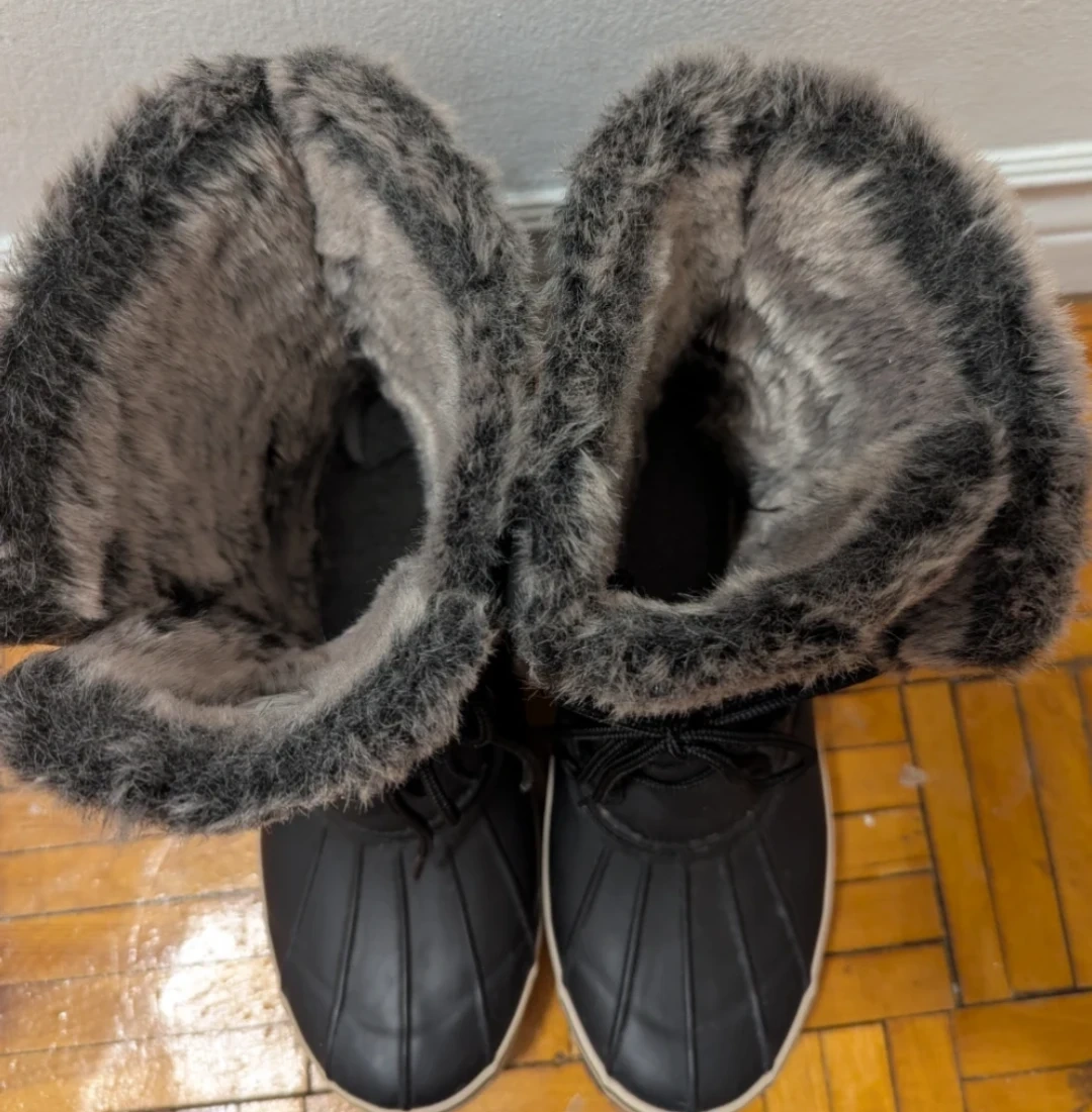 Black winter boots lined with faux fur and featuring 3M Thinsulate insulation. They're water-resistant and impermeable, perfect for keeping your feet warm and dry. These boots offer great traction for snowy or icy conditions.