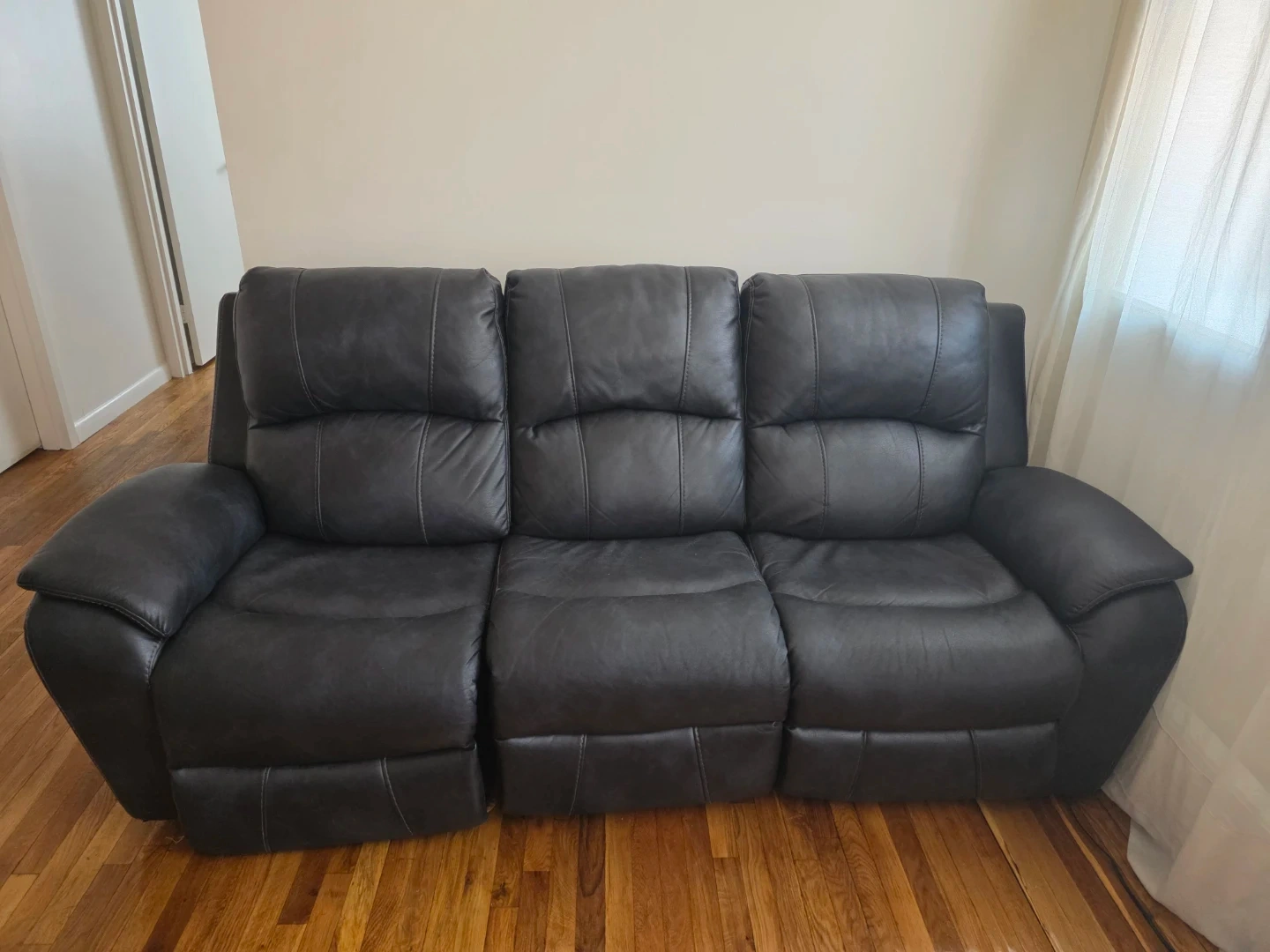 Three-seater reclining sofa in a Gotham blue almost black leather. Features built-in USB charging ports for convenience. Perfect for a living room or media room setup! Two recliners and adjustable head rests. One recliner broken. 300 dollars or best offer.