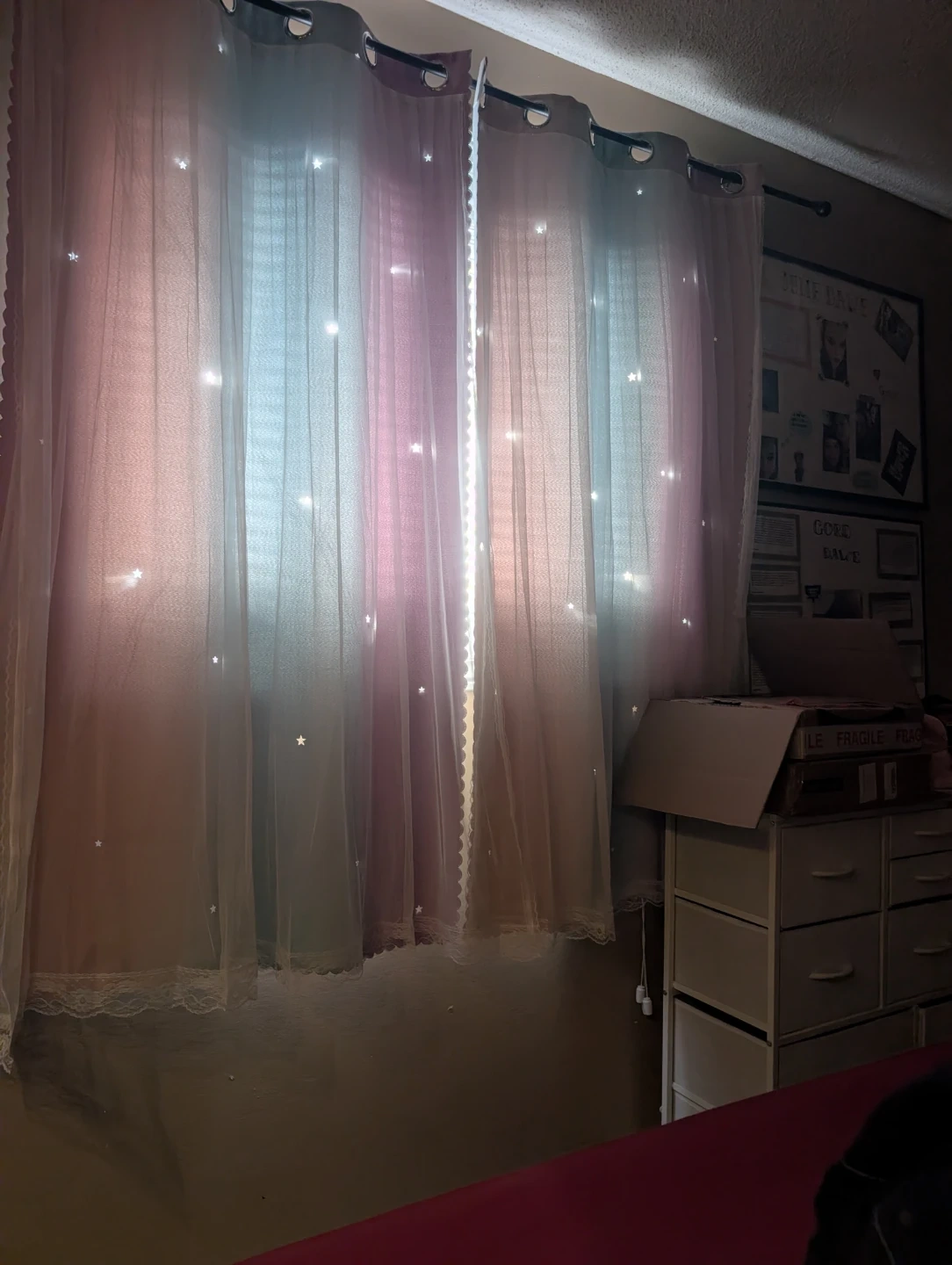 Cute pastel sheer curtains with little star cutouts. They feature a gradient of pink, blue, and purple. The sheer material lets in a lot of light and adds a whimsical touch to any room, while still being able to block out the light. I can deliver same day for an extra fee. Curtain rod not included.