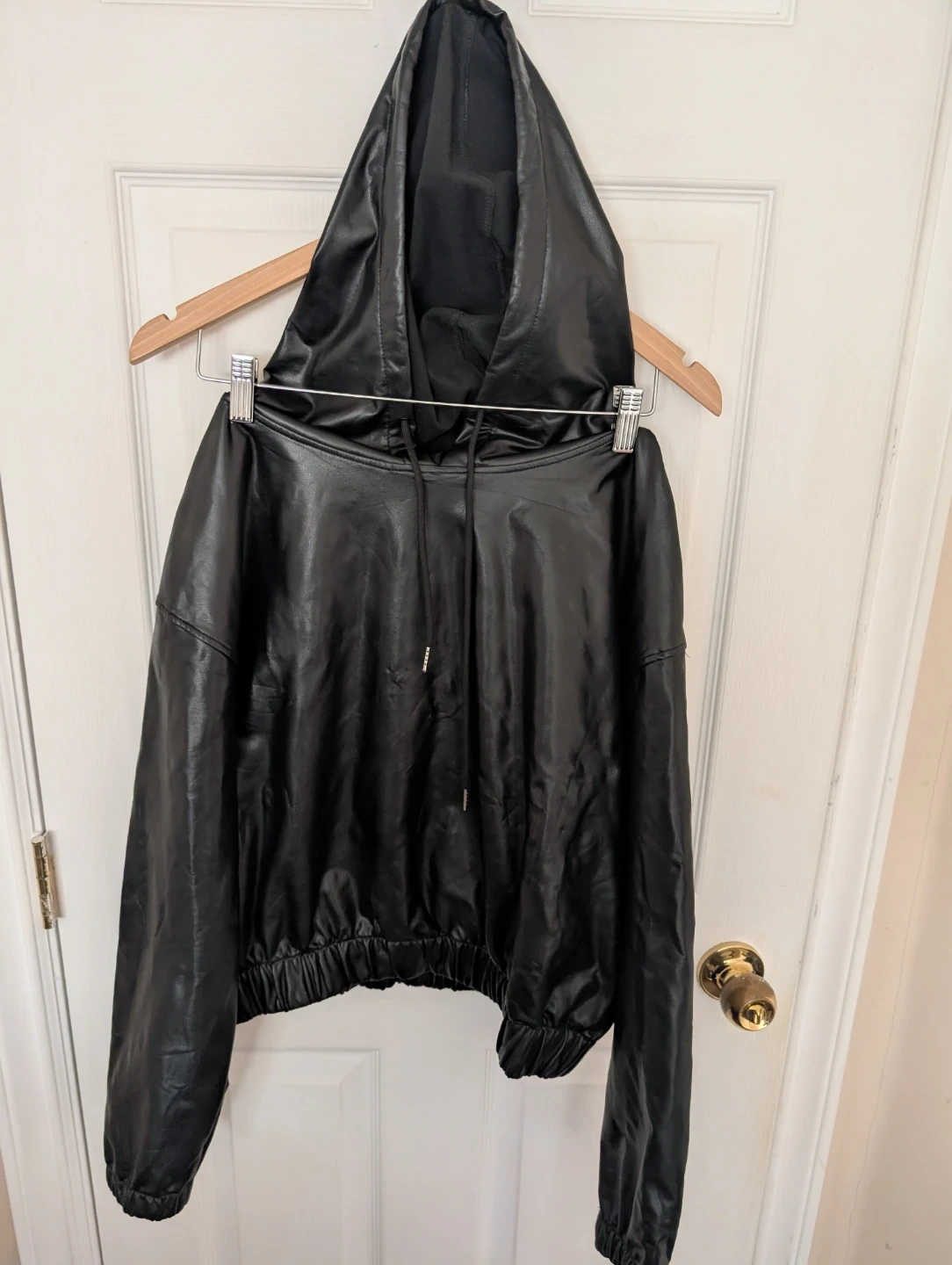 Comfortable black faux leather joggers with elastic waist and cargo pockets. Matching faux leather hoodie with drawstring and elastic cuffs. Both pieces are designed for a relaxed fit. Great for a stylish casual look!
