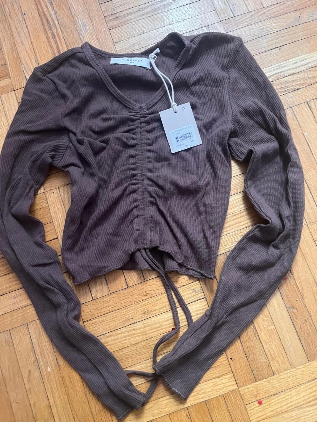 This is a Nude Lucy Lane Drawstring Tee in size XXS and the colour Espresso. It's in great condition and originally bought for $50. A super cute and comfy top to add to your wardrobe!