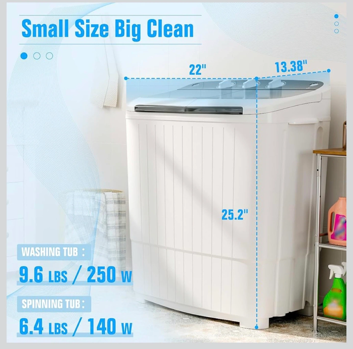 - Washing tub: 9.6 lbs / 250 W