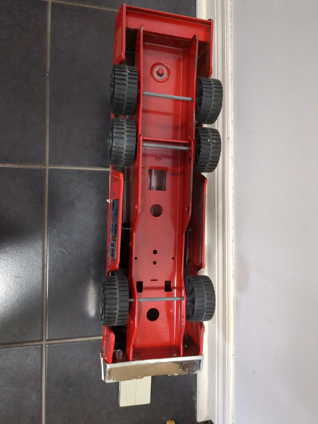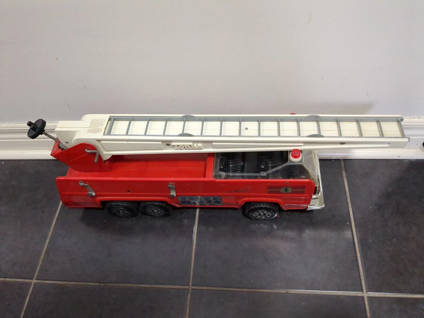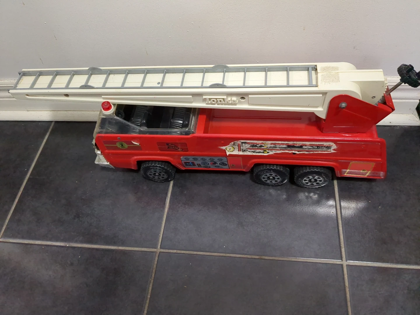 This is a classic red Tonka fire truck with a functioning ladder. It's a durable metal toy, perfect for imaginative play. The ladder extends and retracts for exciting rescue missions! Open to reasonable offers. Missing push nut for ladder.