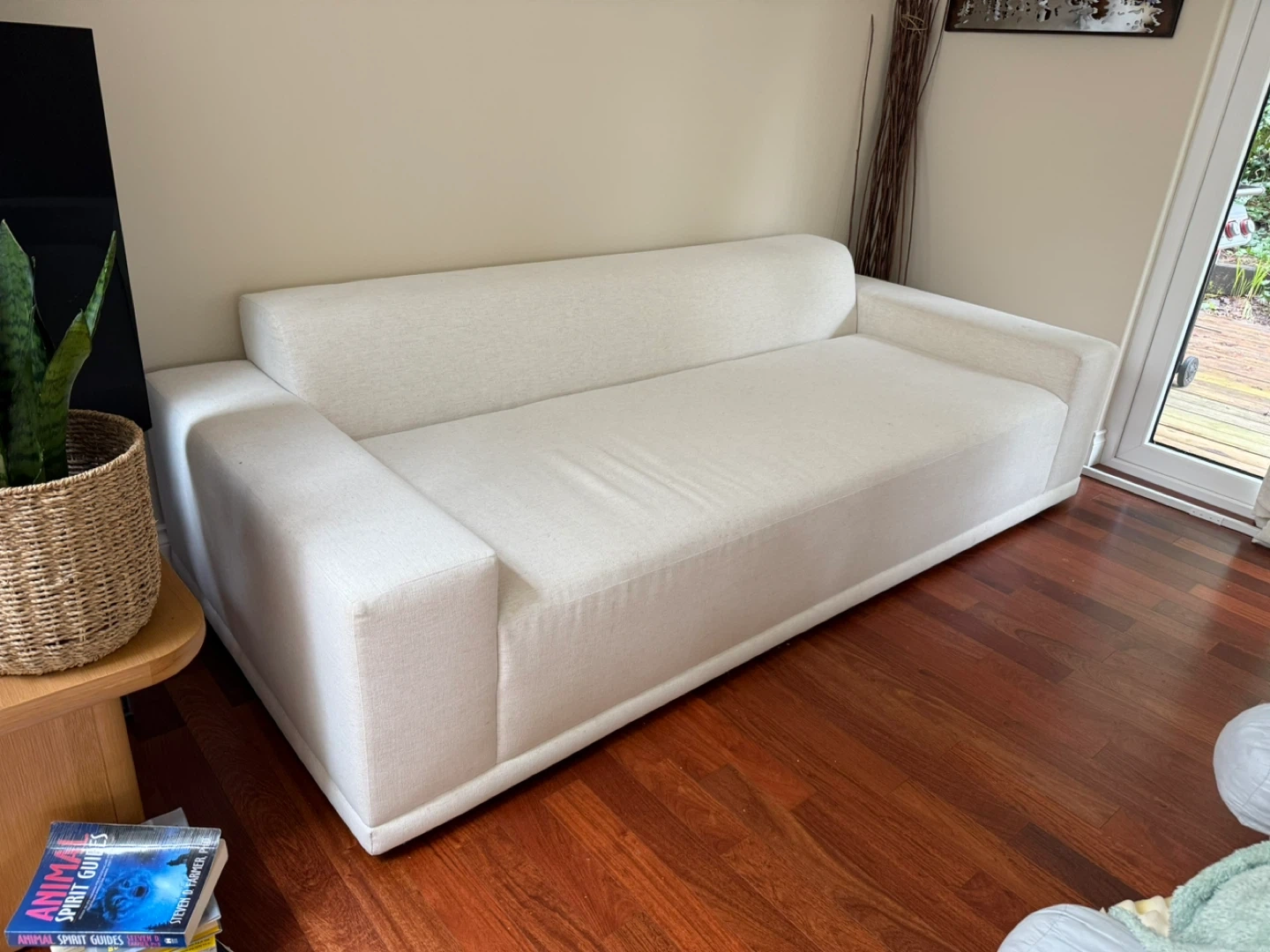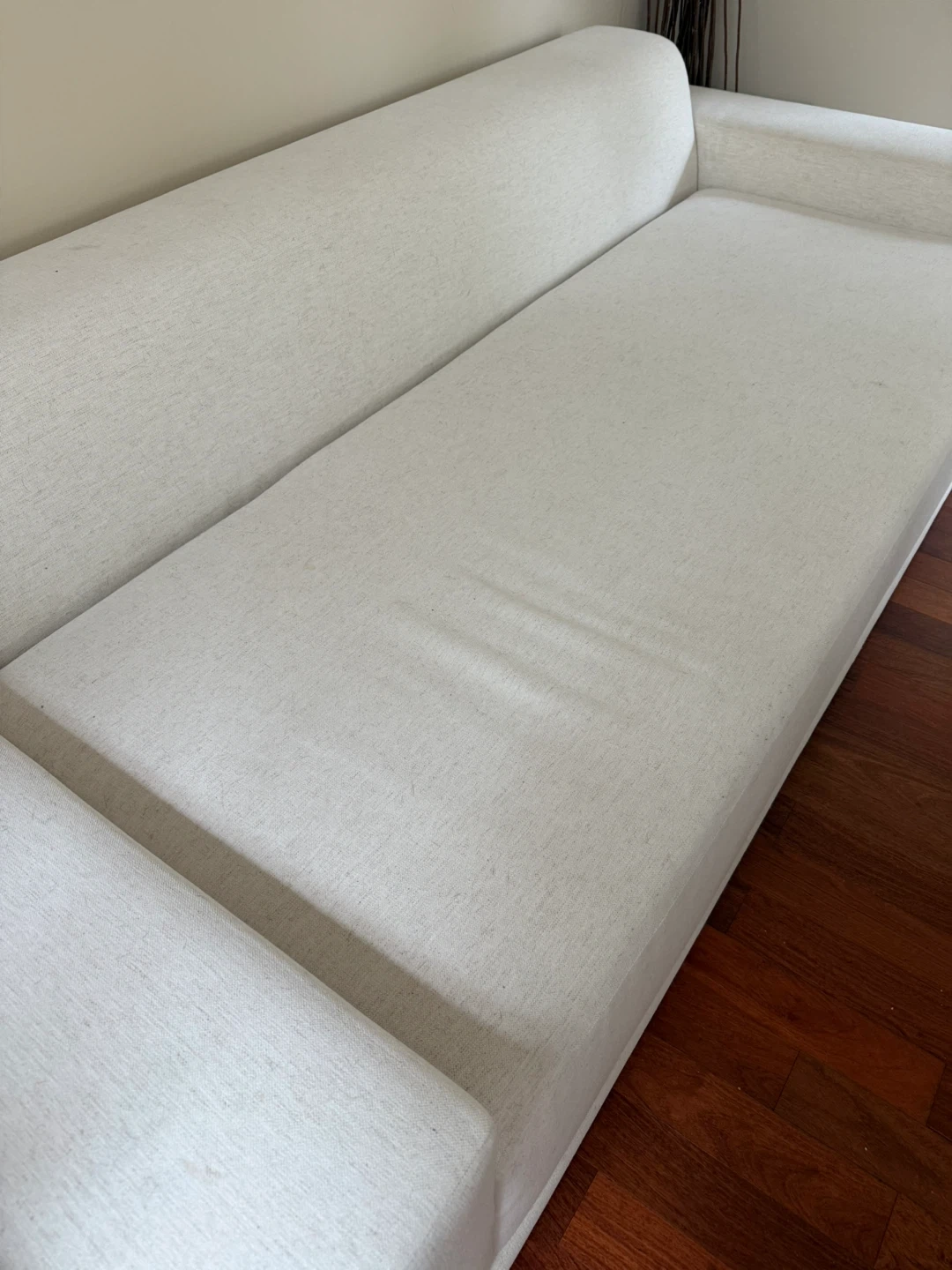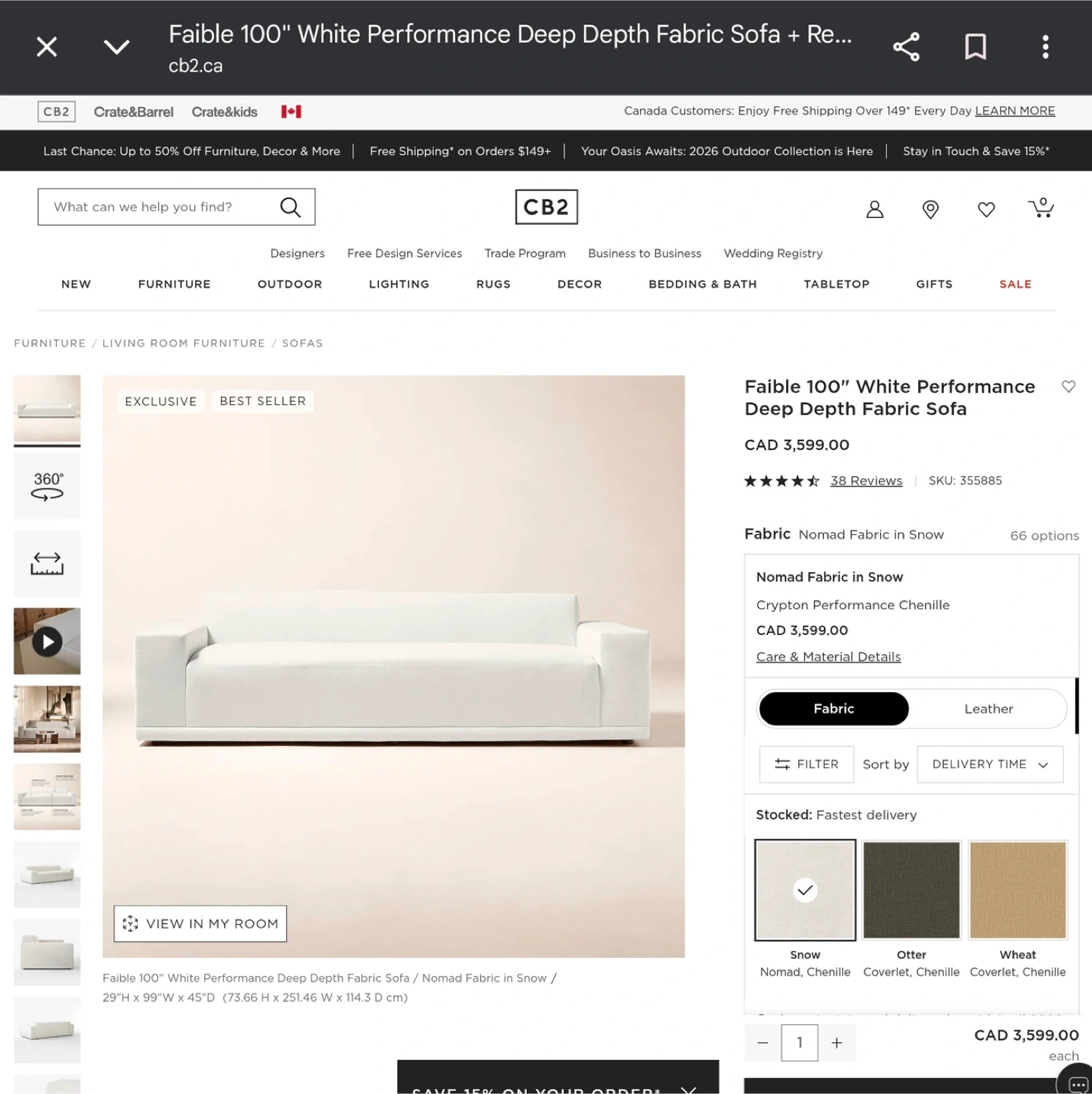 This CB2 sofa is upholstered in Nomad Fabric in Snow. It's a deep depth sofa, perfect for lounging. The fabric is performance chenille for durability.