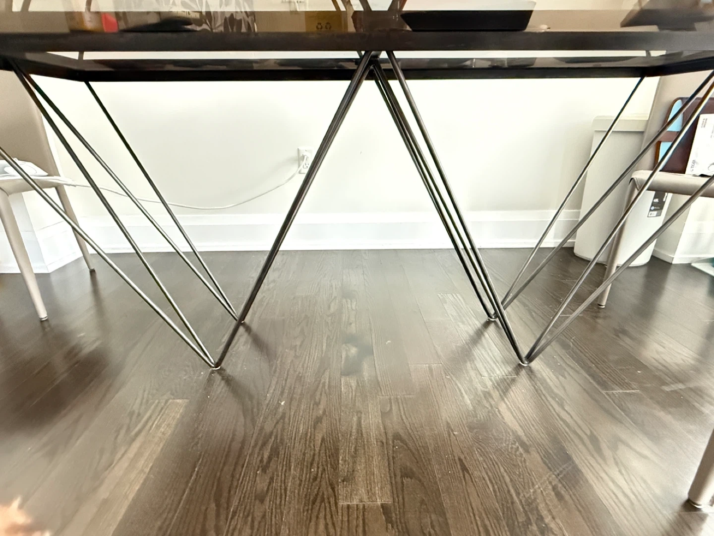 Selling a dining table with chairs. The set features a glass top table with a unique geometric metal base and accompanying chairs with a beige finish. Great for a modern dining space!