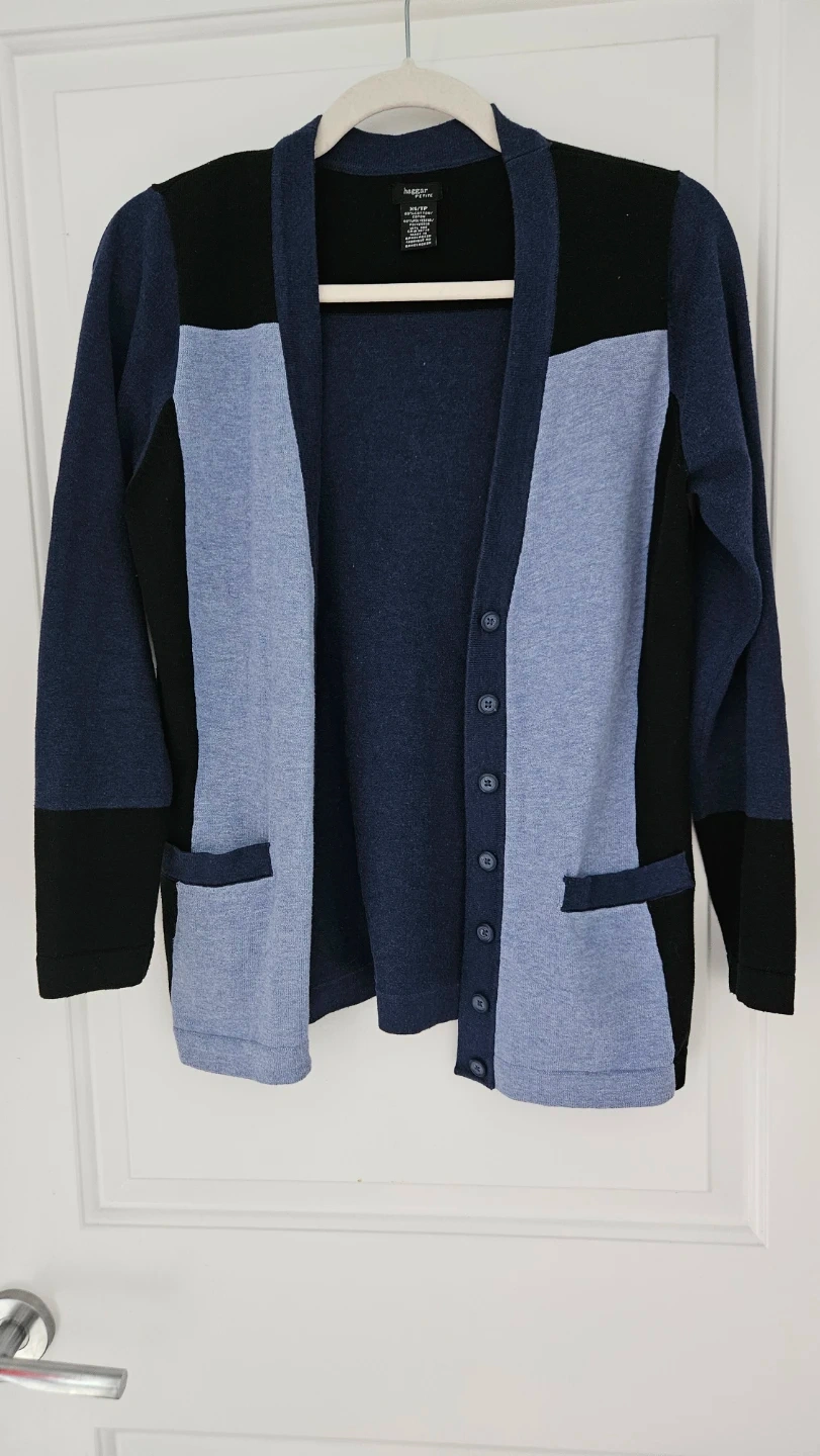 Selling a beautiful women's colour block cardigan from Haggar Petite, in size XS (also fits Size Small). It's made of 60% cotton and 40% polyester. Features button-up front and two front pockets.