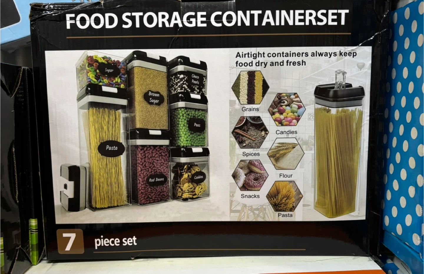 This is a 7-piece food storage container set. Airtight containers help keep food dry and fresh. Clear design lets you see contents easily.
