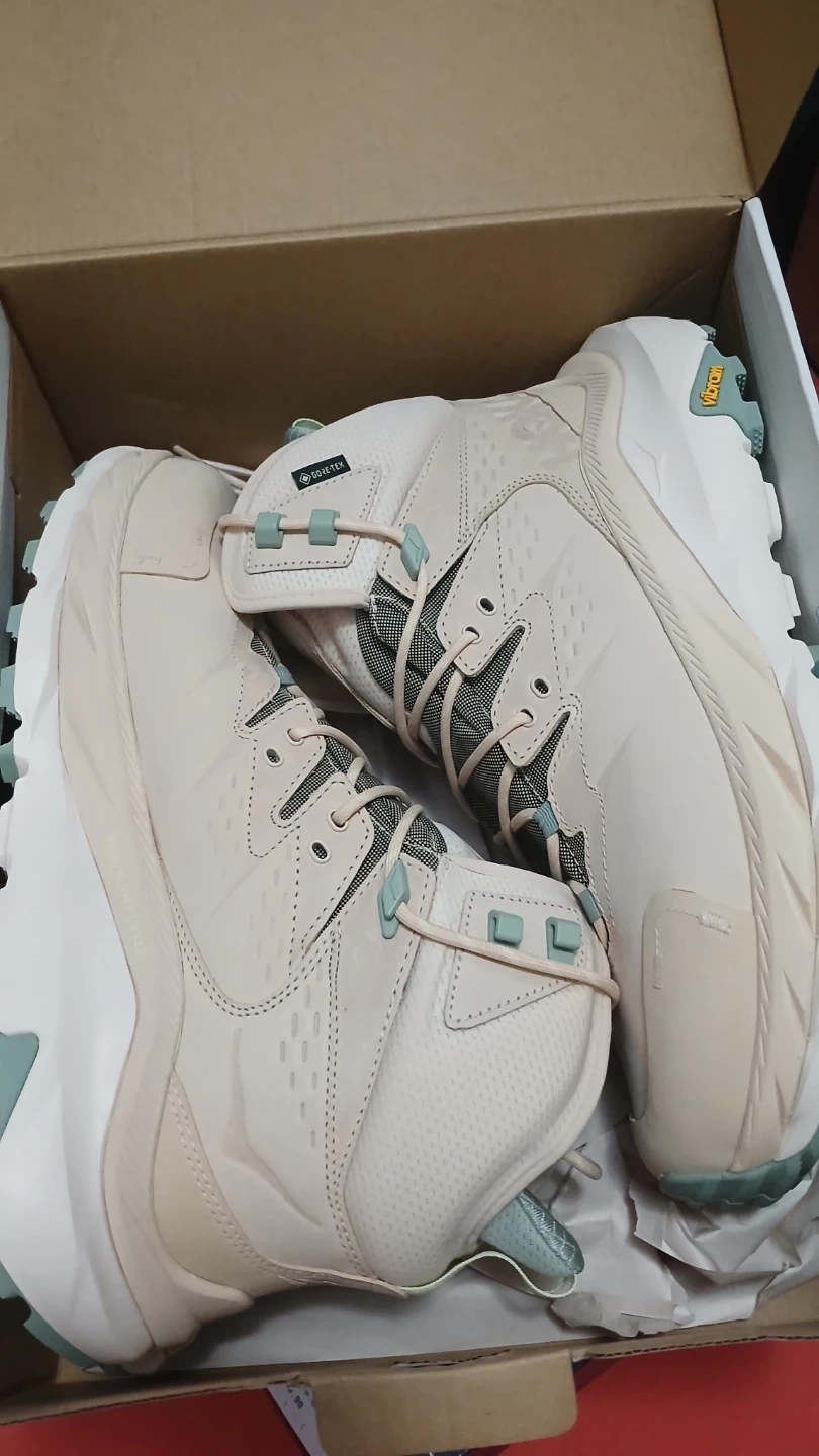Lightweight Hoka trail running shoes with Gore-Tex. Features a Vibram sole for excellent traction. Comes in a light tan/beige colour.