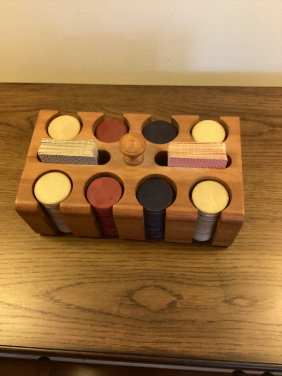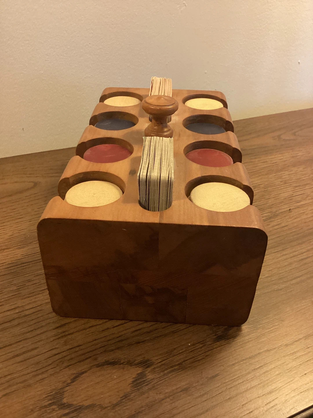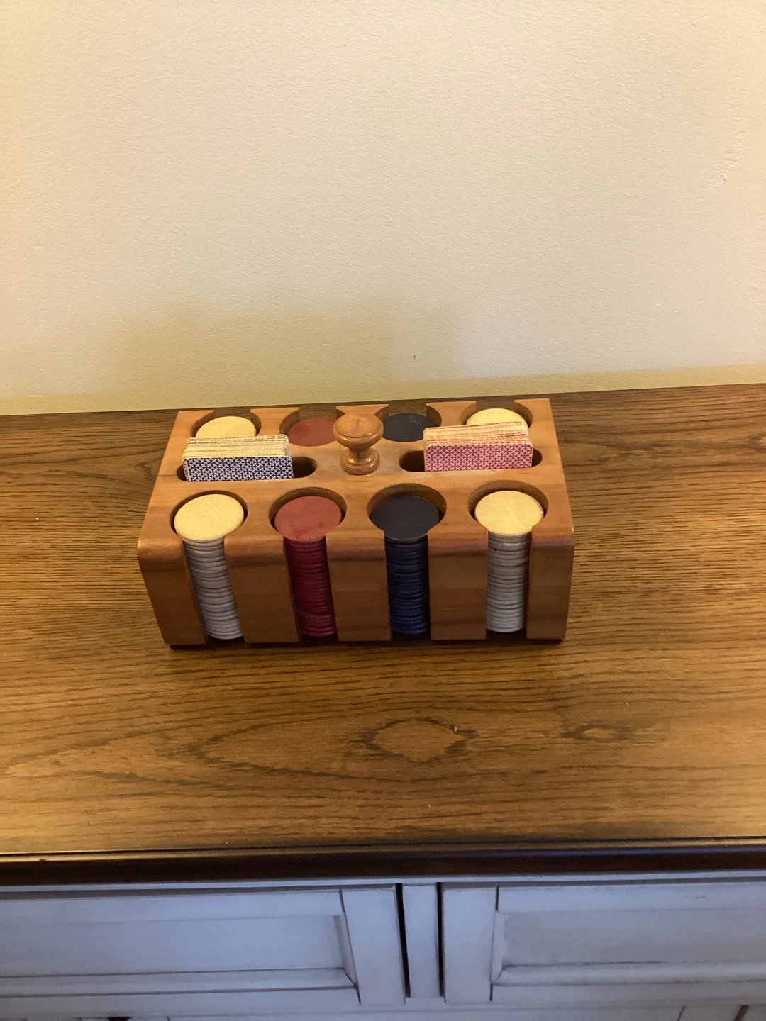This antique wooden chip and card holder features slots for poker chips and decks of cards. It's made of solid wood with a natural finish. Perfect for game nights or as a decorative piece for your home.