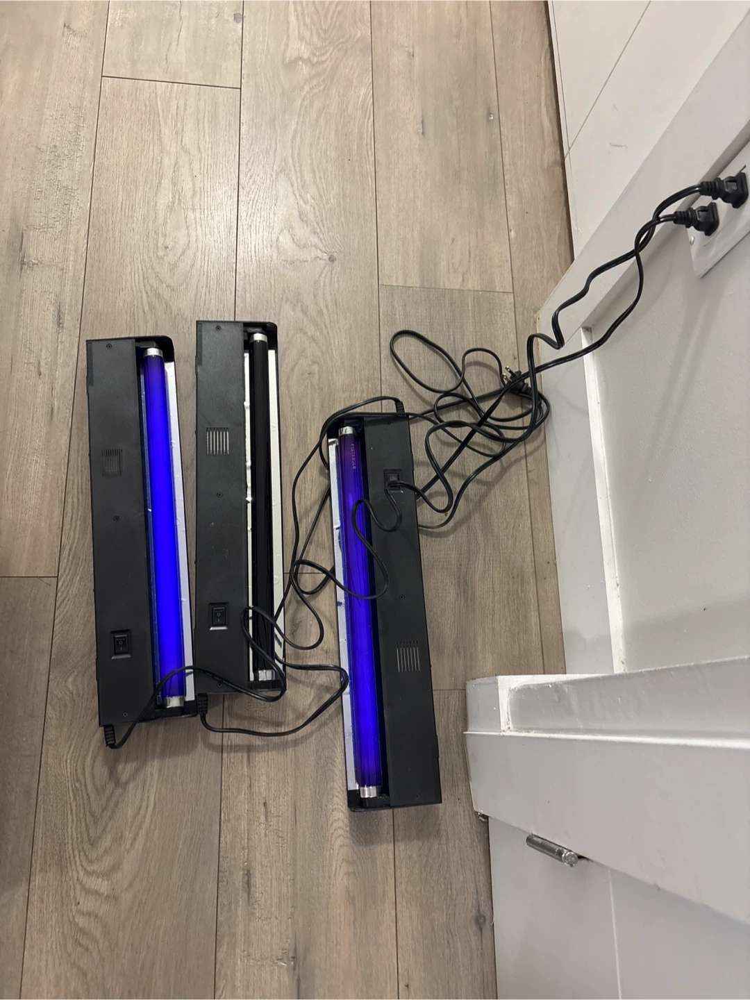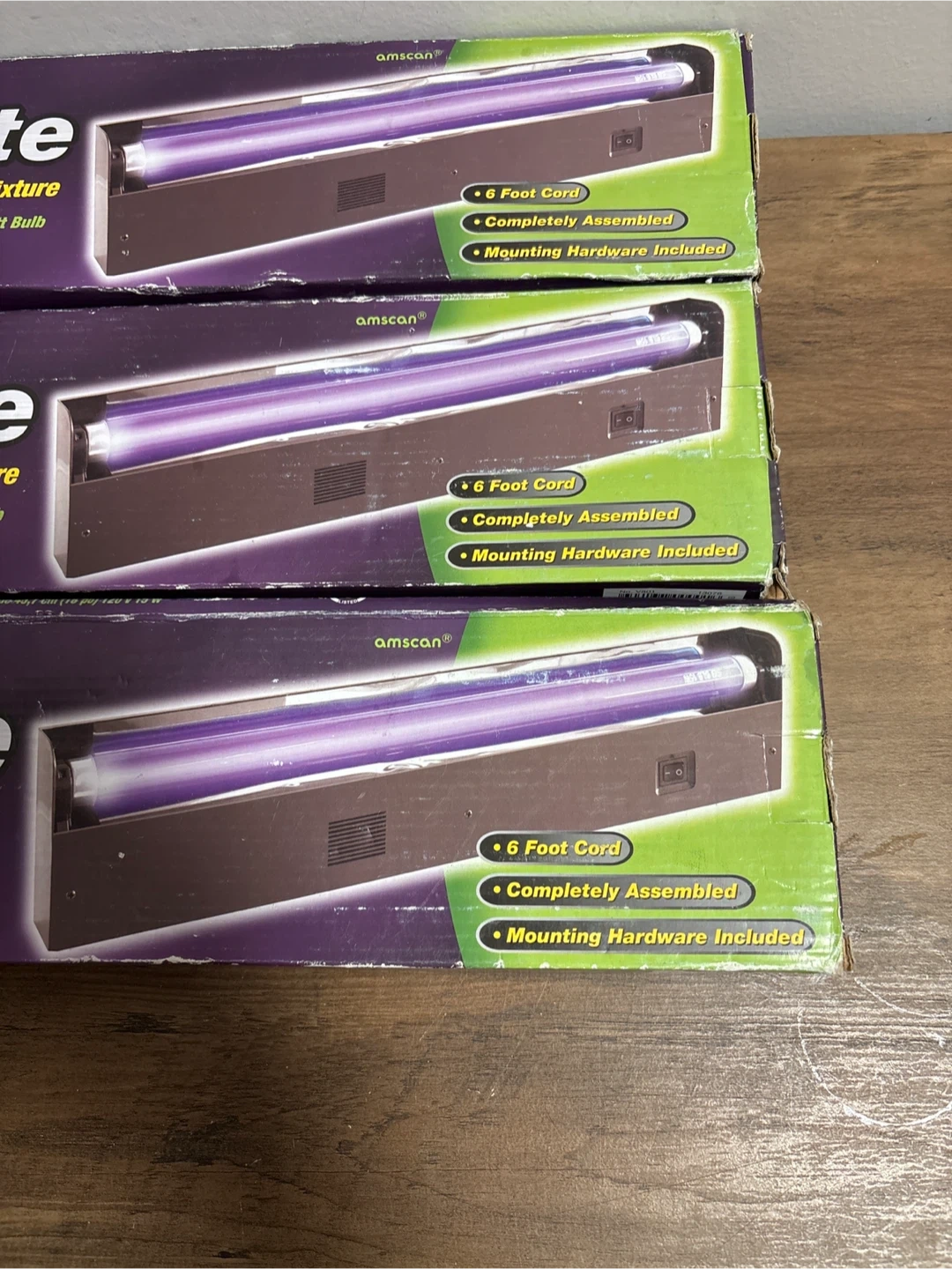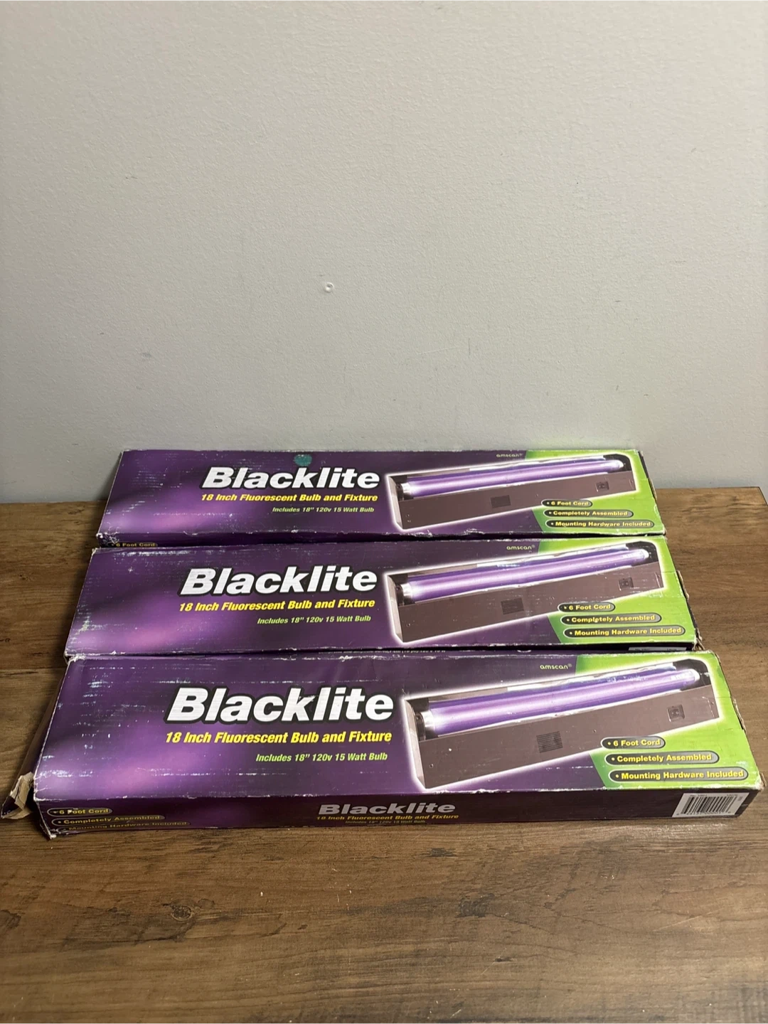 Three Blacklite 18-inch fluorescent bulb and fixture sets. Each includes an 18" 120V 15 Watt bulb, a 6-foot cord.