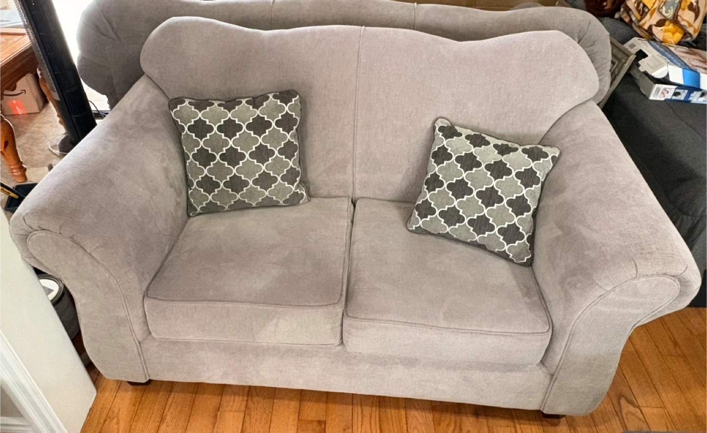 Grey fabric loveseat, three seater, and chaise. Comes with four decorative throw pillows and two lumbar pillows. Upholstery is soft to the touch.