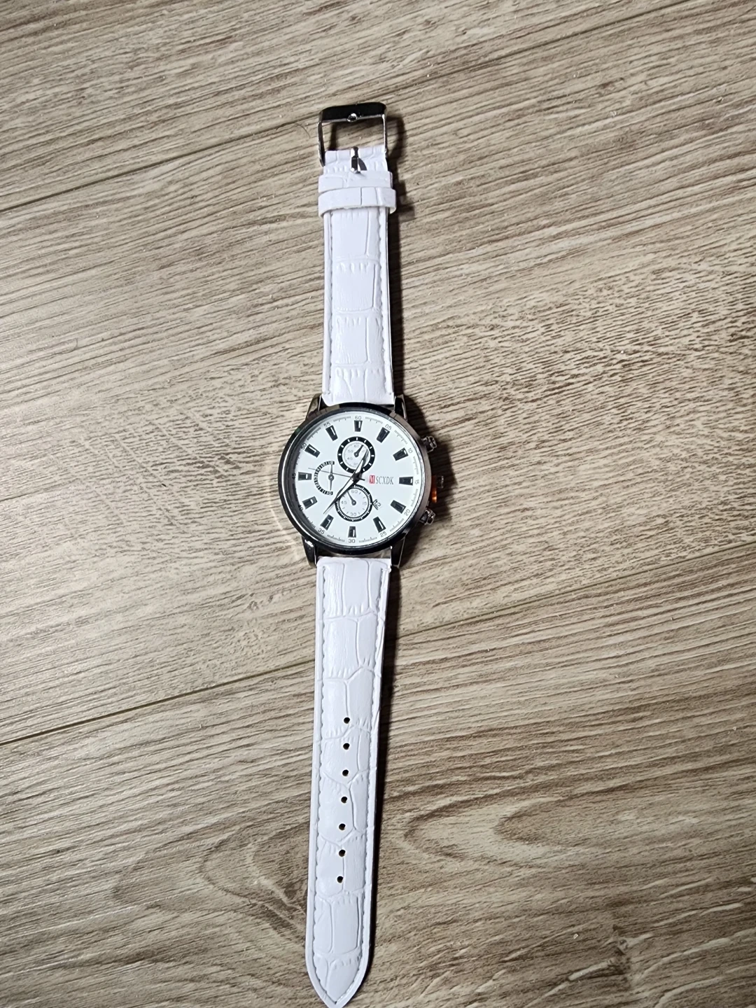 This is a white leather strap watch. It has a silver-tone case and a white dial with multiple subdials. The band is made of textured leather.