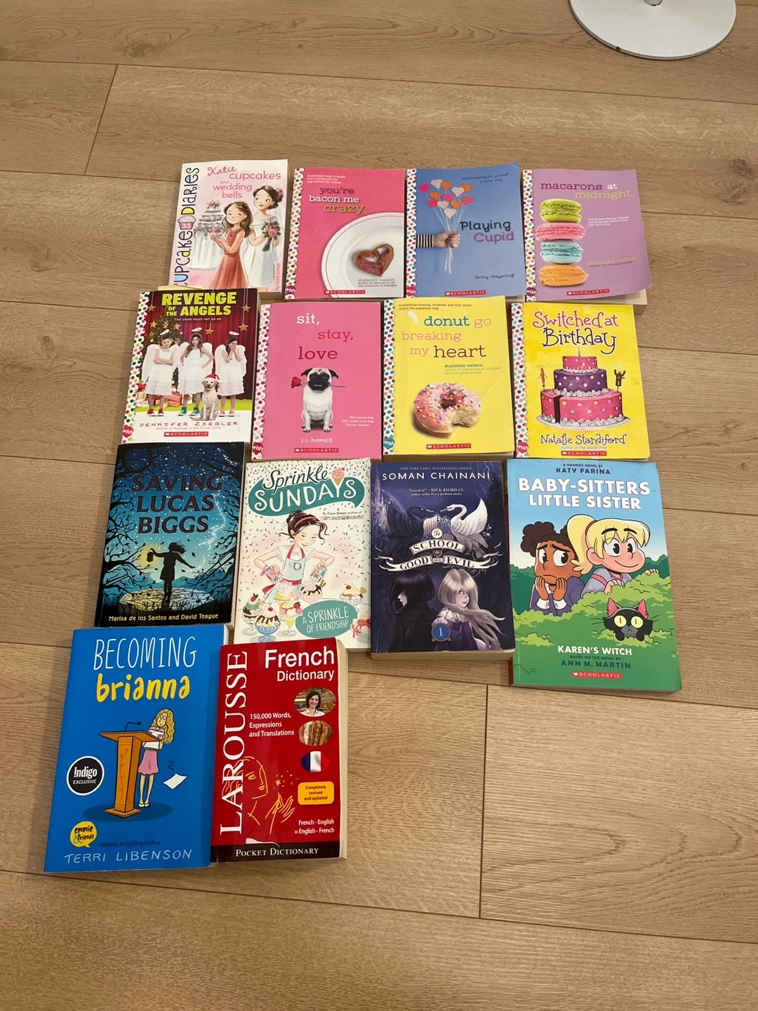 Includes "Becoming Brianna", "Baby-Sitters Little Sister", "Saving Lucas Biggs", "A Sprinkle of Friendship", and others. Also features a "Larousse French Dictionary". These books are great for young readers. A mix of fiction and educational titles are included.