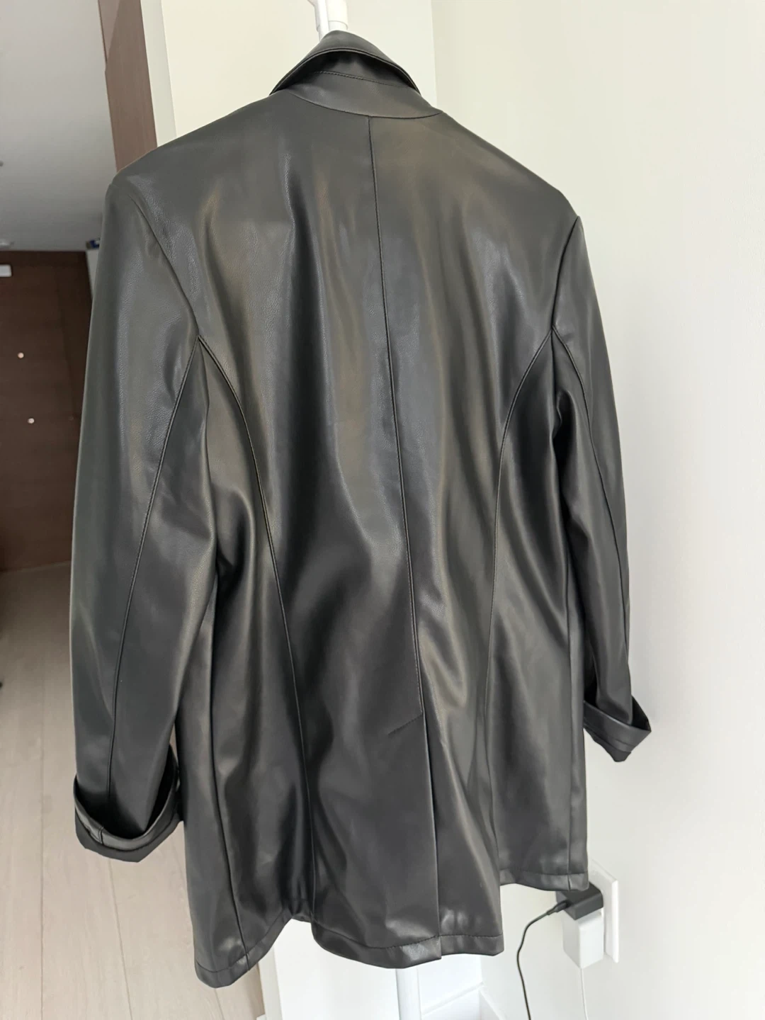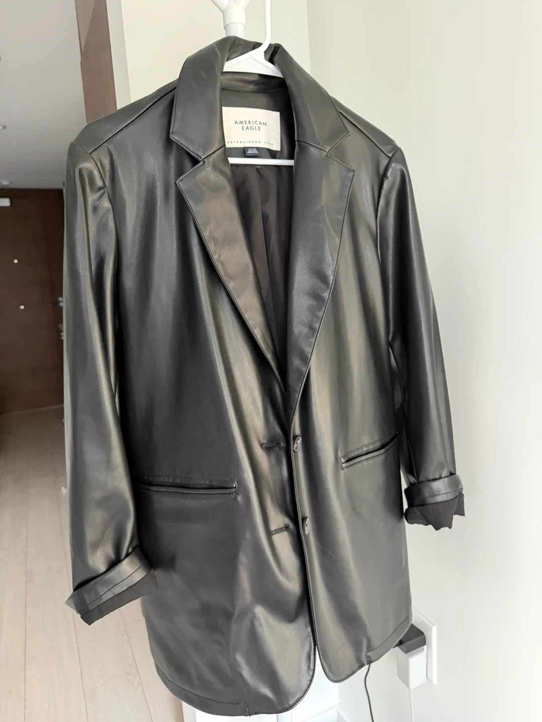 Selling an American Eagle faux leather blazer in black. It's in great condition and ready for a new home! Perfect for adding a bit of edge to any outfit. It's a versatile piece that can be dressed up or down