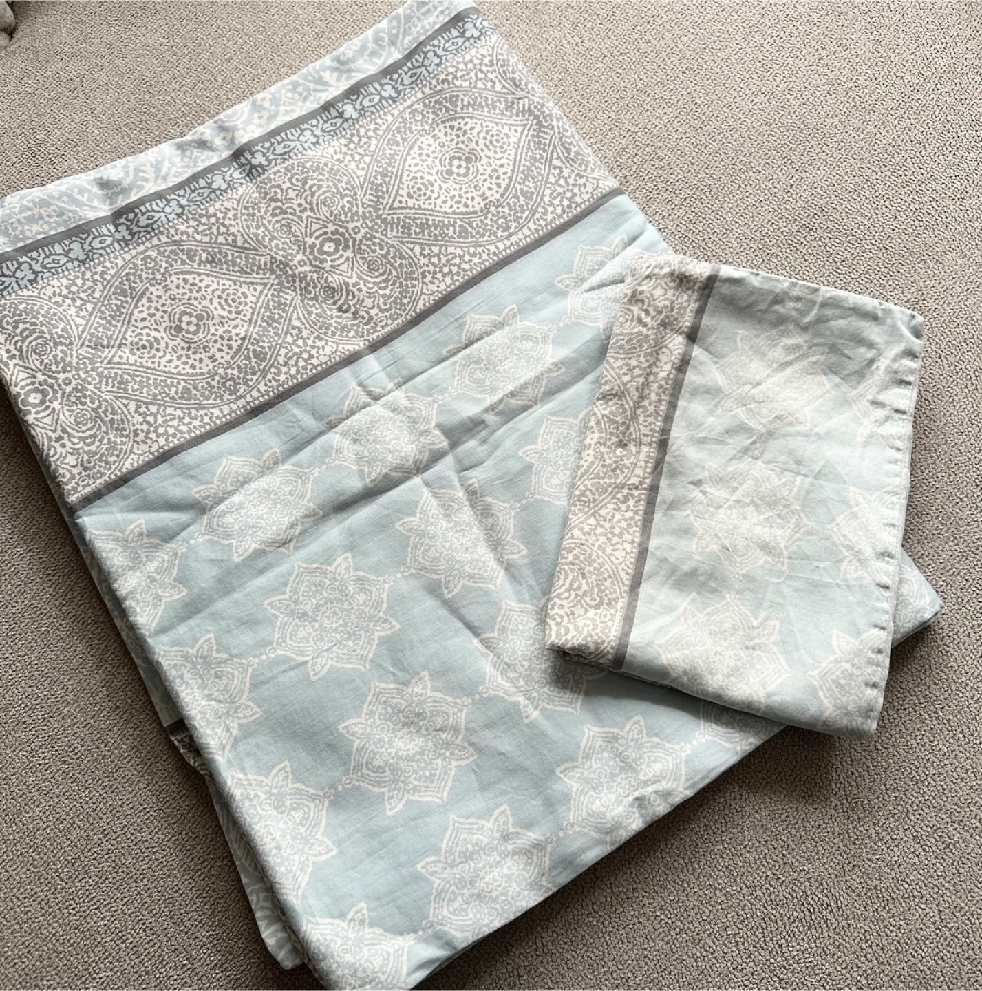 Twin Duvet Cover featuring a light blue and grey damask-inspired pattern. Cotton blend material. Standard size. Add a touch of style to your bedding!