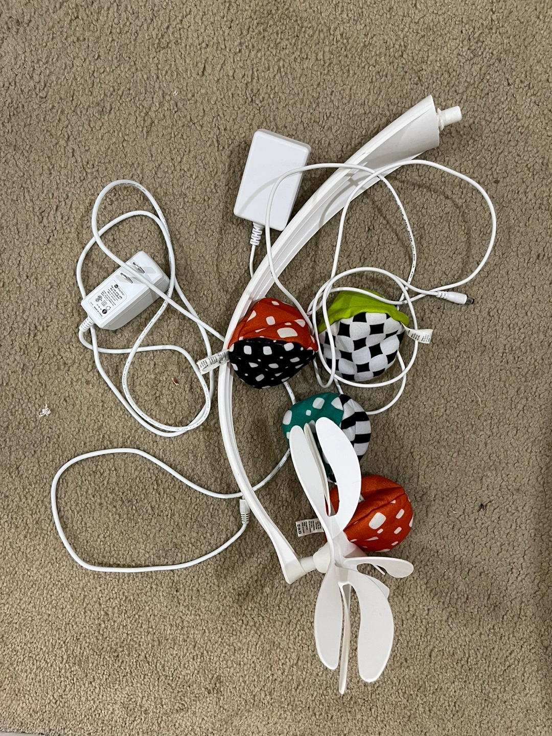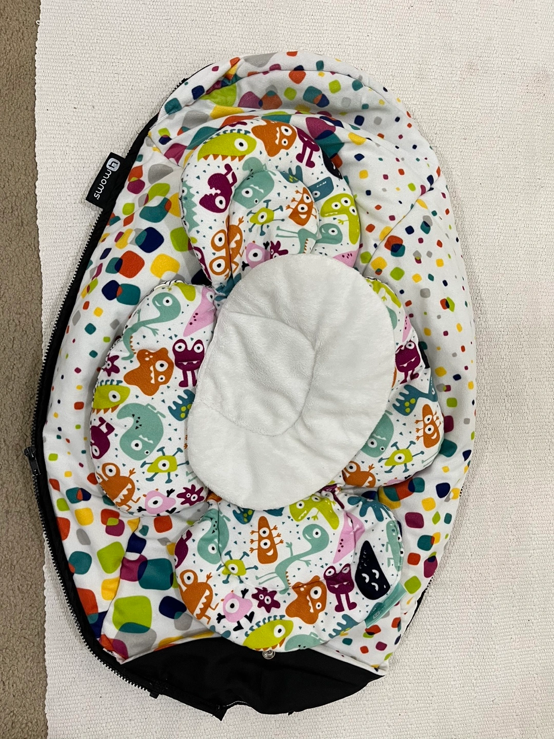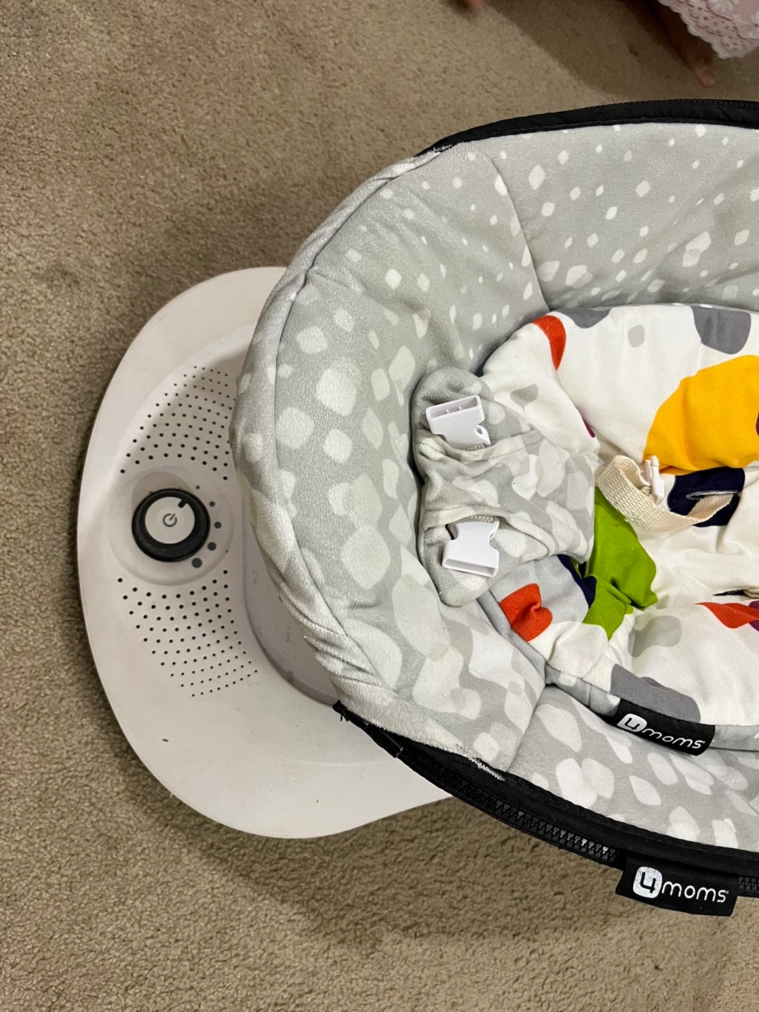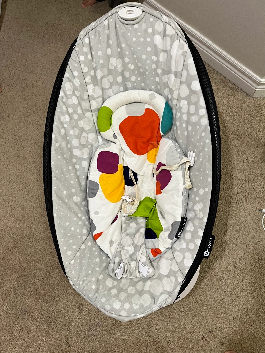 134moms MamaRoo 4 baby swing with mobile and multiple fabric inserts. Includes power adapter.