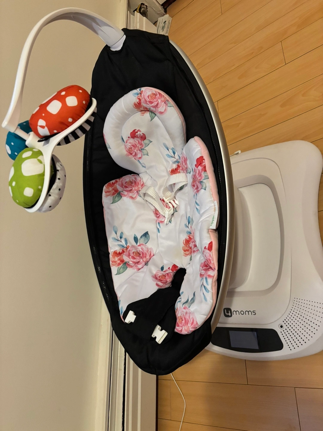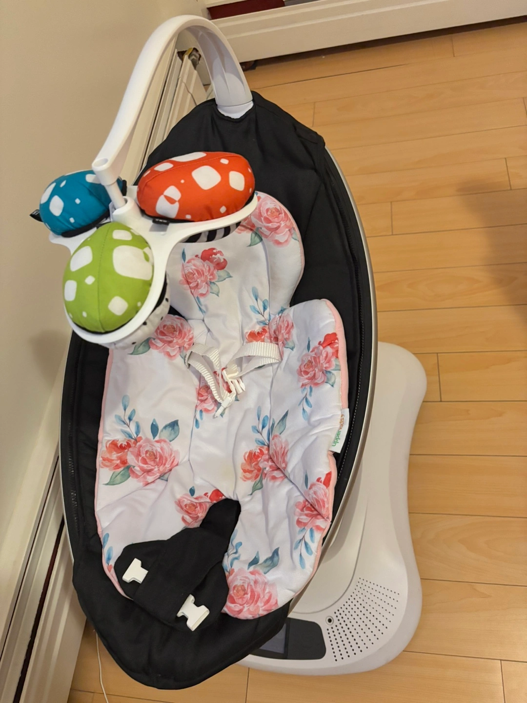 17Baby swing with multiple swing motions, speeds, and sounds. Includes a toy bar with three plush toys.