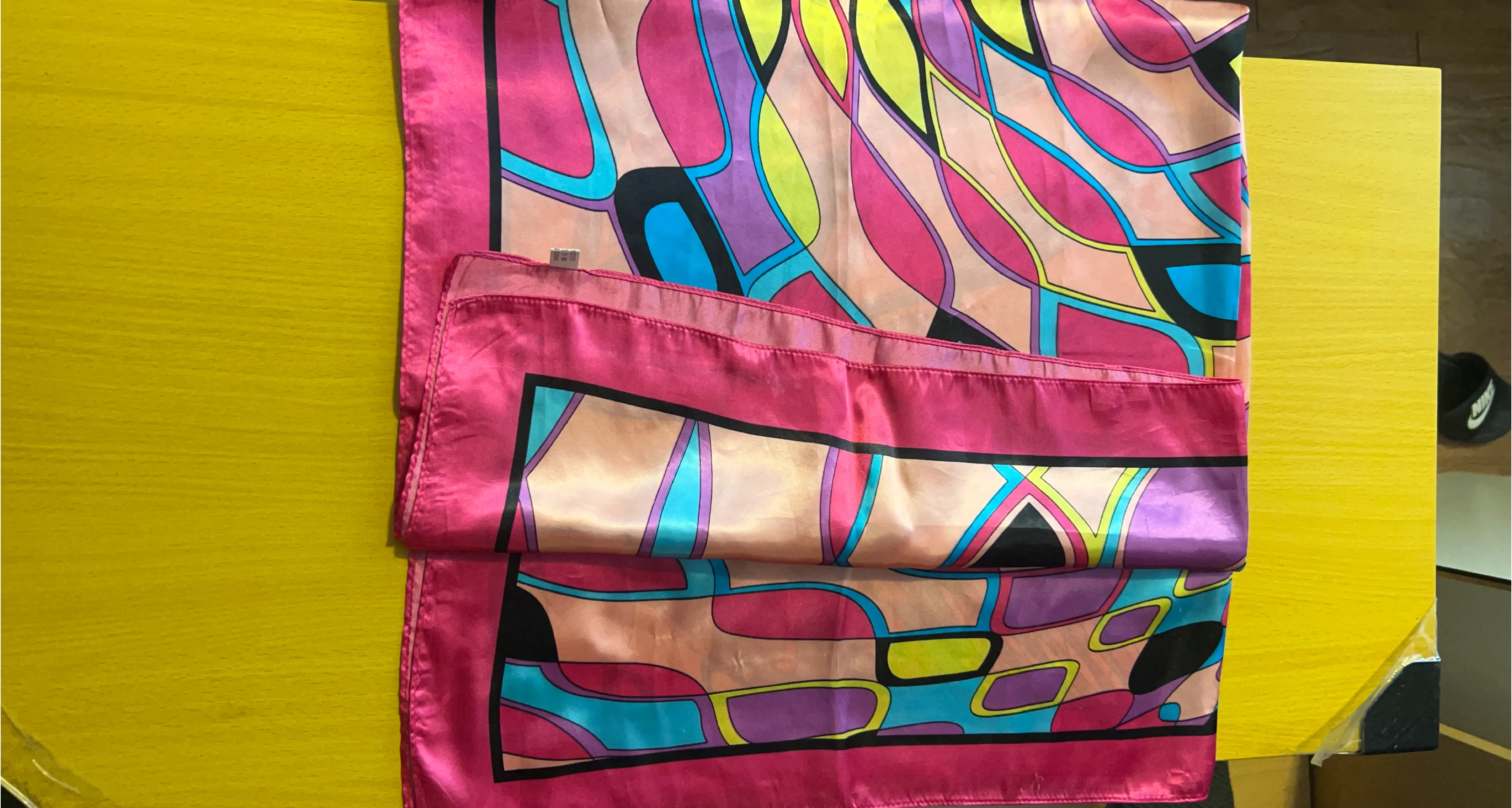 A colourful silky scarf with a bold geometric pattern. It's a lovely accessory for adding a pop of colour to any outfit. Material is silky smooth.